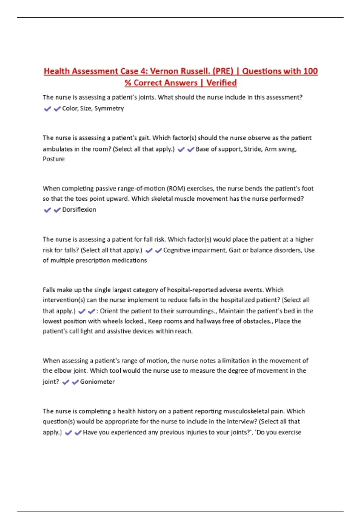 Health Assessment Case 4: Vernon Russell. (PRE) | Questions with 100 % Correct Answers | Verified