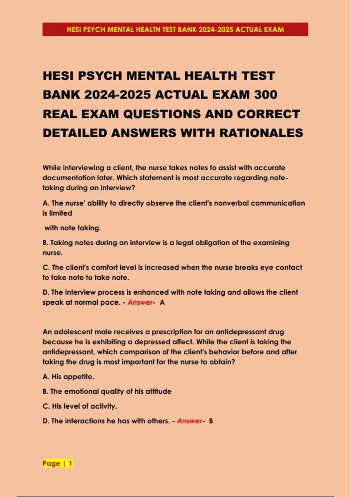 , HESI PSYCH MENTAL HEALTH TEST BANK 2024-2025 ACTUAL EXAM