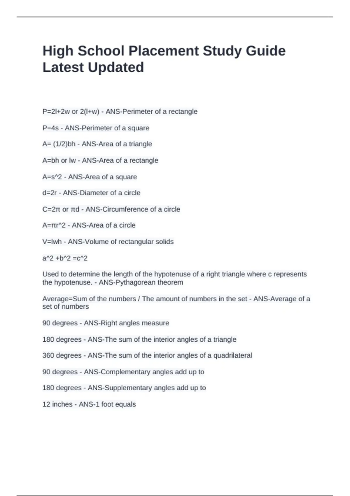 High School Placement Study Guide