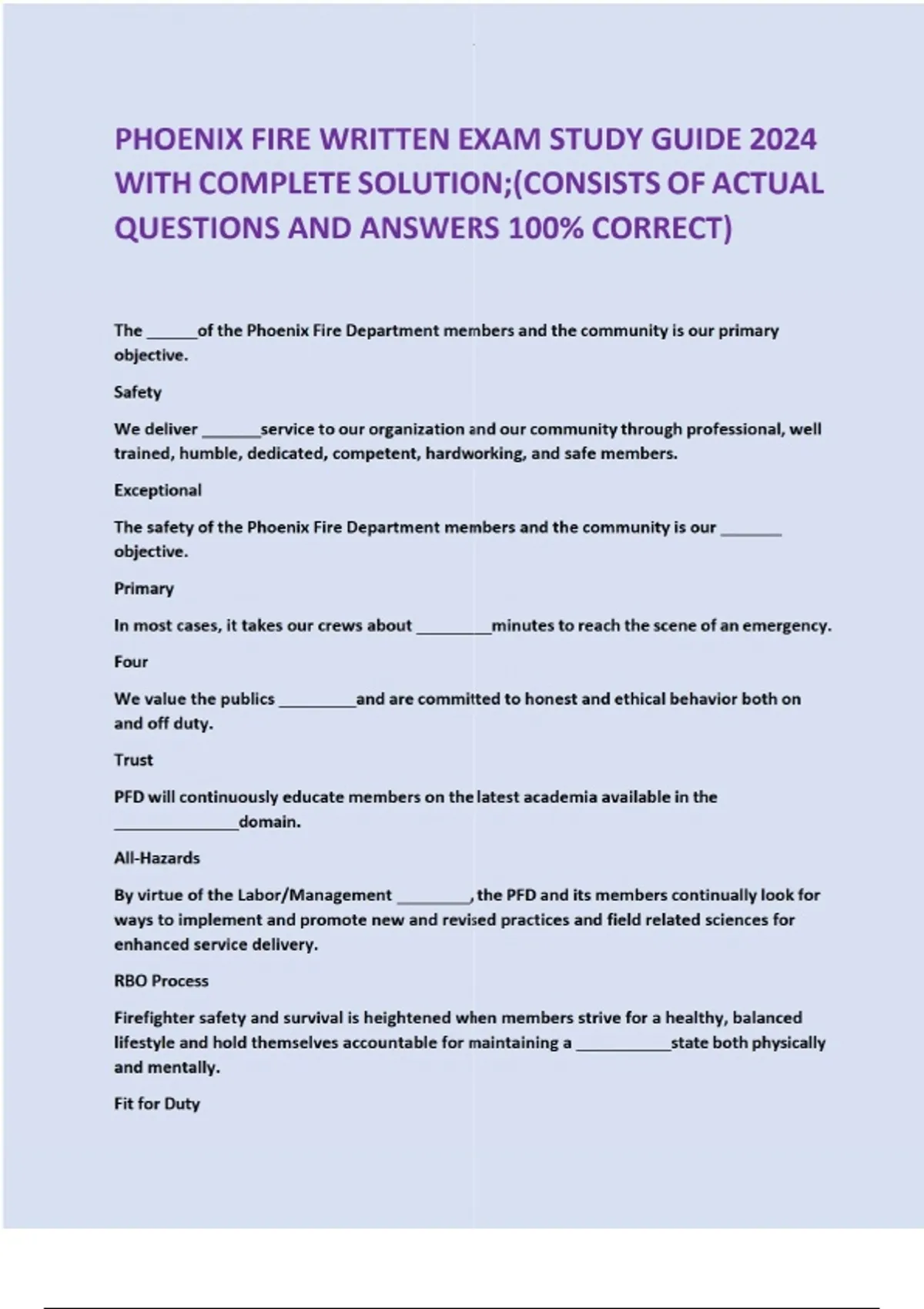 PHOENIX FIRE WRITTEN EXAM STUDY GUIDE 2024 WITH COMPLETE SOLUTION;(CONSISTS OF ACTUAL QUESTIONS AND ANSWERS 100% CORRECT) The of the Phoenix Fire Department members and the community is our primary objective. Safety We deliver service to our organization and our community through professional, well trained, humble, dedicated, competent, hardworking, and safe members. Exceptional The safety of the Phoenix Fire Department members and the community is our objective. Primary In most cases, it takes our crews about minutes to reach the scene of an emergency. Four We value the publics and are committed to honest and ethical behavior both on and off duty. Trust PFD will continuously educate members on the latest academia available in the domain. All-Hazards By virtue of the Labor/Management , the PFD and its members continually look for ways to implement and promote new and revised practices and field related sciences for enhanced service delivery. RBO Process Firefighter safety and survival is heightened when members strive for a healthy, balanced lifestyle and hold themselves accountable for maintaining a state both physically and mentally. Fit for DutyThough the nature of our calls may change, the tactical objectives for every incident remain the same: Life safety, , and property conservation. Hazard Mitigation are clearly defined department expectations that identify behaviors, actions, and responsibilities that begin at dispatch and are ongoing throughout response, arrival, and while on scene. Rules of Engagement To reduce or eliminate safety hazards, management and members will rely on clearly stated expectations and actions consistent with . Department Standard Operating Procedures (SOP's) Phoenix Firefighters respond , anytime, day and night. Safely and Quickly Firefighters are expected to hustle to the truck, safely respond and deliver our services with great skill. Problem solving As professional members of this organization we provide on every emergency incident and with each customer encounter, Quality Service Our risk management plan is the of the safety of our members. Foundation Members must work towards current skills and developing new ones. Strengthening Company and command officers must have a clear understanding that they serve a key role in influencing the behaviors and actions of their crews in all three stages. Leadership Our success in accomplishing the goal of always keeping our members safe begins in the stage. Pre-Incident Pre-Incident preparation is where we maintain and ensure that all equipment is and in a "ready state".Operational Training should regularly fire ground survival skills, and Mayday readiness to help maintain proficiency. Reinforce The Phoenix Fire department was initially formed only to extinguish fires, but we have changed vastly over the years to to the needs of the public. Adapt The Phoenix Fire department is continually innovative and efficient opportunities to serve and protect the citizens of our community. Exploring We consider every recruit our and therefore focus everything we do on meeting the needs of our customers. Customer When a recruit firefighter provides a positive attitude, and the willingness to learn, the RTO's will provide everything possible to help them be . Successful You must meet these standards to successfully complete the training Academy, and the probationary period. Subsequent The professional standards guide provides the mission vision, and values that are the focus of delivery and behavior for all our members. Service Our goal is to always provide exceptional customer service, through professionalism, and to our members, and to those who need our assistance in our community. Integrity Organizational values are intended to govern the responsibilities of all members within an organization. Ethical What year was the PFD established? 1886The PFD way is founded upon major cornerstones that make up the foundation for our philosophy. Six Cornerstone 2: Be Accountable Accountable members take responsibility for their success and for the success of the . Department Each member is responsible for their behavior and actions and will conduct themselves in a professional manner while . On and Off Duty Our members through hard work and dedication, have built an unmatched legacy of service and . Professionalism The core of our strength comes from our members fundamental execution of , high professional standards, and our personal pride. Excellent customer service The membership of the PFD expects unyielding and personal accountability from everyone. Professionalism Our individual position within the Phoenix Fire department are irrelevant when it comes to our standard of . Customer Service Though our names and ranks are stenciled on the front of our uniforms, we are perceived as . One As members of the Phoenix Fire department, we are to our customers. Indistinguishable Collectively, we have been entrusted to serve and our community and we answer this calling in a variety of ways.Protect Members of the Phoenix Fire department hold themselves to a . Higher Standard Failure to comply with the Phoenix firefighters will not be tolerated by the community we serve, our leaders, or each other. Standard of customer service In many cases, our customers identify all members of the phoenix fire department as . Firefighters We take great pride in all of our work, and our united standard of excellent . Customer service The is the philosophy of the Phoenix Fire department and describes what is expected of every member, regardless of rank. PFD Way The PFD way incorporates many values which include safety, service excellence, , professionalism, communication, teamwork, and respect. Integrity The PFD is committed to its and their well-being. Members The of our members is the strength and foundation of the Phoenix Fire department. Diversity Our diverse membership chose to become part of the Phoenix Fire department. In turn, we all chose to to the PFD wa