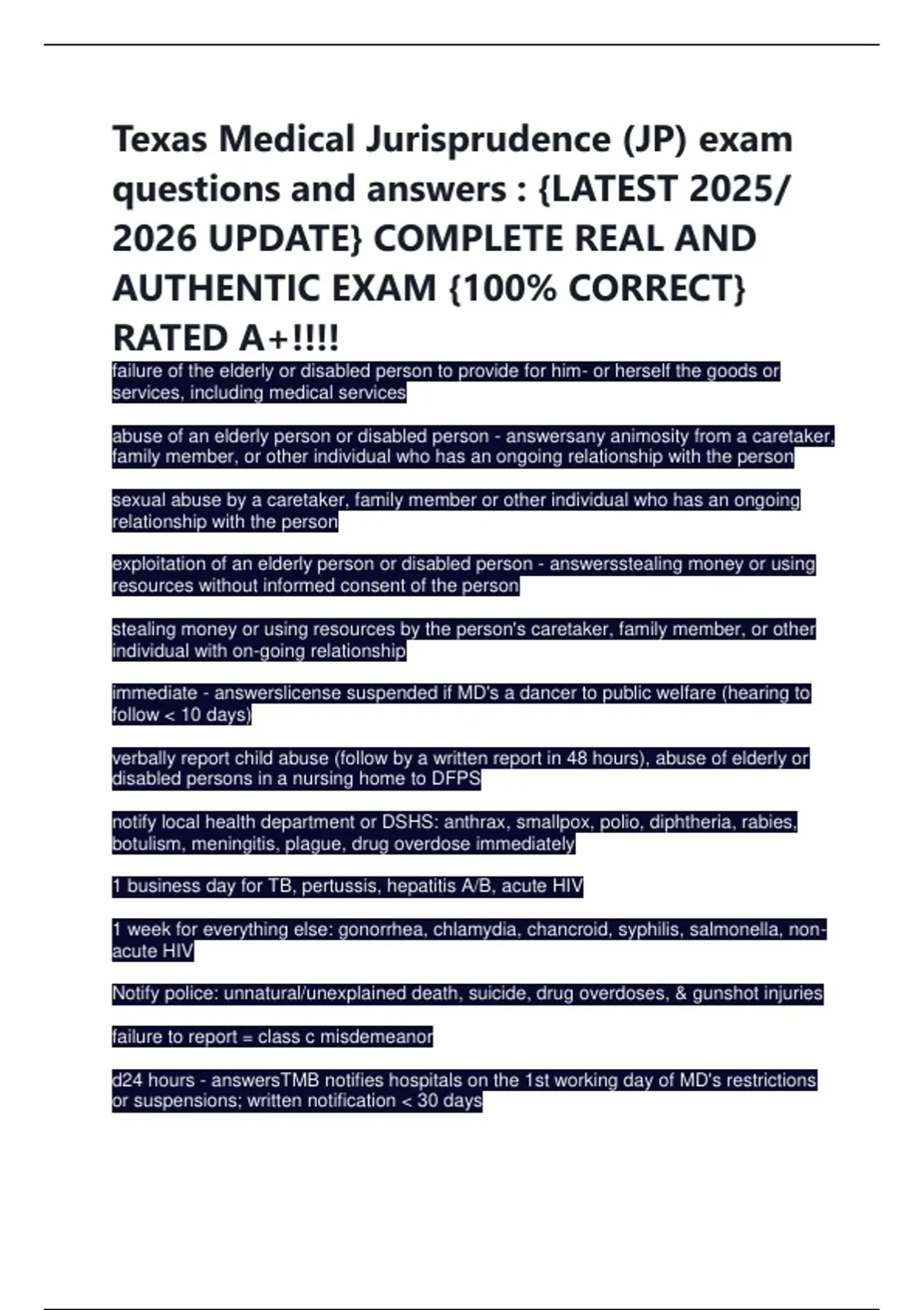 Texas Medical Jurisprudence (JP) exam questions and answers : {LATEST 2025/ 2026 UPDATE} COMPLETE REAL AND AUTHENTIC EXAM {100% CORRECT} RATED A+!!!! failure of the elderly or disabled person to provide for him- or herself the goods or services, including medical services abuse of an elderly person or disabled person - answersany animosity from a caretaker, family member, or other individual who has an ongoing relationship with the person sexual abuse by a caretaker, family member or other individual who has an ongoing relationship with the person exploitation of an elderly person or disabled person - answersstealing money or using resources without informed consent of the person stealing money or using resources by the person's caretaker, family member, or other individual with on-going relationship immediate - answerslicense suspended if MD's a dancer to public welfare (hearing to follow 10 days) verbally report child abuse (follow by a written report in 48 hours), abuse of elderly or disabled persons in a nursing home to DFPS notify local health department or DSHS: anthrax, smallpox, polio, diphtheria, rabies, botulism, meningitis, plague, drug overdose immediately 1 business day for TB, pertussis, hepatitis A/B, acute HIV 1 week for everything else: gonorrhea, chlamydia, chancroid, syphilis, salmonella, non acute HIV Notify police: unnatural/unexplained death, suicide, drug overdoses, & gunshot injuries failure to report = class c misdemeanor d24 hours - answersTMB notifies hospitals on the 1st working day of MD's restrictions or suspensions; written notification 30 days notify local health department or DSHS: TM, pertussis, hepatitis A/B, acute HIV 48 hours - answersreports DFPS of all suspected child abuse child abuse confirmation in writing (oral report immediately) notice to parents of unemancipated minor with impending abortion 3 dasy - answersMD can request OPC (order or protective custody) from judge for involuntary detention of psych patient OPC lasts 30 days, after which MD has to file for a 90-day commitment patient can request a probable cause hearing 72 hours to try to get released MD must evaluate the patient 12 hours pharmacacist can dispense 3-day supply of scheduled III-V medication (e.g. Xanax) if provider cannot be reached for a refill 5 days - answersMD has to complete medical certification after receiving death certificate nursing home abuse confirmation in writing (oral report immediately) filing birth certificate 7 days - prescriptions & drugs - answersnotify local health department or DSHS for all other communicable diseases: gonorrhea, chlamydia, chancroid, syphilis, salmonella, non-acute HIV MD can discharge a patient from hospital 7 day supply of schedule II-V prescriptions MD must mail in the actual written Rx 7 days after calling in a schedule II Rx in an emergency for an amount lasting only for the duration of the emergency 10 dasy - answersfiling death report by funeral director (MD completes medical certification 5 days after receiving death certification) mail letter denying patinet's request for medical record due to non-payment of required mailing/processing fees (cannot be due to non-payment of medical bill) MD has to visit underserved/rural clinic run by midlevels every 10 days 15 days - answersMD to provide requested medical records (calendar days for hospital; business days for MD) MD sends letter denying patient's request for medical records letter to TMB of adverse event causing unanticipated hospital admission 24 hours or death of the patient 72 hours from a procedure 21 days - answersdefendant/MD must file any objection with the court regarding malpractice lawsuit deadline schedule II Rx must be filled & cannot have refills 30 days most deadlines. - answersso guess 30 days when in doubt `TMB ----- MD communication regarding license/lawsuits/appeals/penalties - answersTMB notifies healthcare facilities on the 1st working day of any MD's restrictions or suspensions; written notification 30 days notify TMB of pending lawsuits if you're not insured; otherwise, your insurance will do it for you notify TMB 30 days if disciplinary action from the hospital affects MD's privileges 30 days notify TMB any conviction or deferred adjudication verdict for any felony or misdemeanor involving moral turpitude, abuse of medicare/medicaid program, & narcotic violation. Do not wait until time for renewal. MD can wait until time of renewal to notify TMB for anything else Clerk of the court of record will need to forward a copy of the conviction/adjudication 30 days regardless of whether the adjudication/finding is subsequently with held/appealed length for appeal when investigated or suspended by TMB notify TMB any name & practice address changes provide a 30-day grace period of continued patient care until a new MD is found (i.e terminate physician-patient relationship) hospitals have 30 days to submit a bill letter to DSHS reporting 3rd trimester abortion & emergent abortions on unemancipated minors 45 days - answersMD provides medical records to suing attorney time for insurer to pay after receipt of bill from MD (either regular bill or worker's comp)