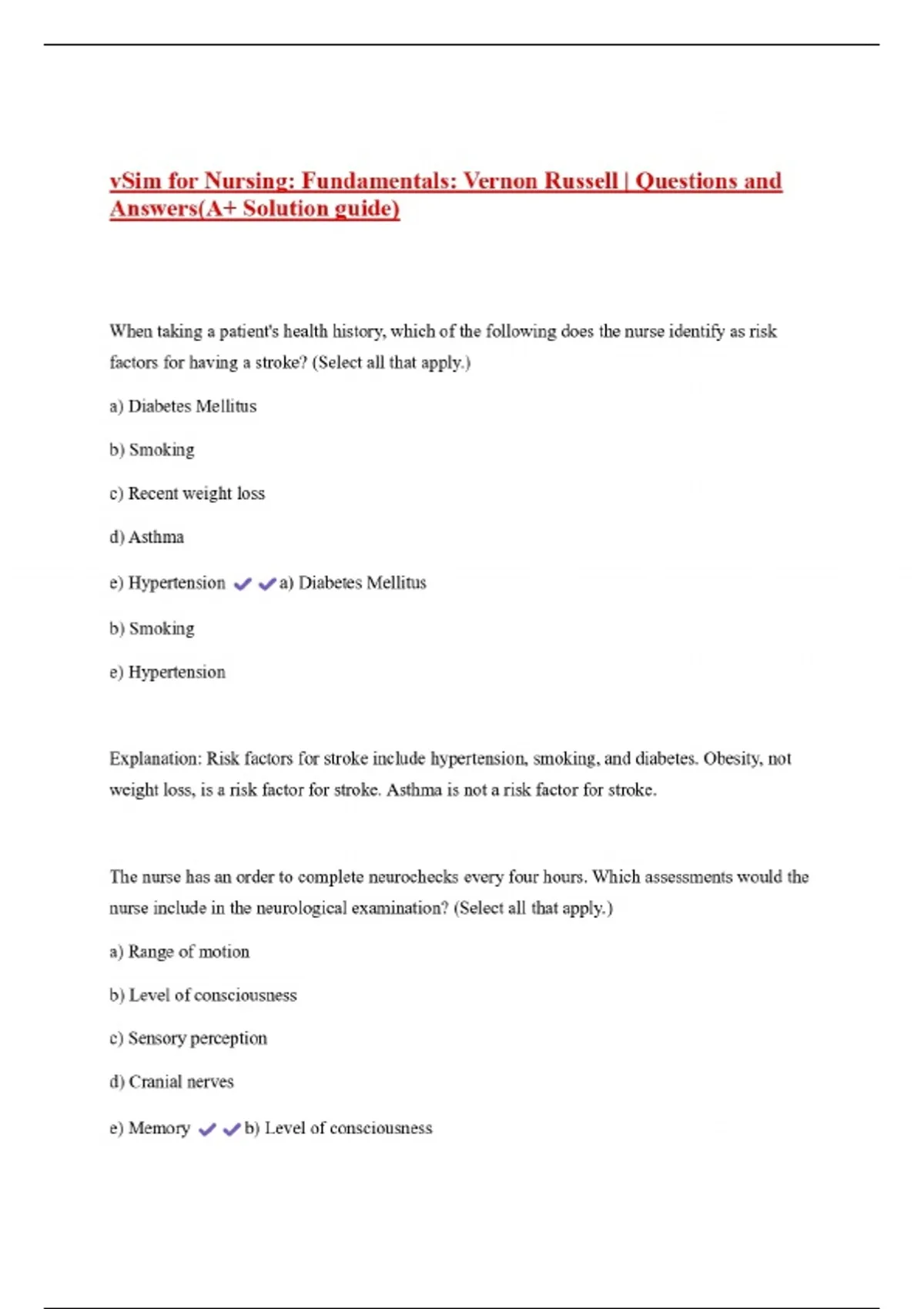 vSim for Nursing: Fundamentals: Vernon Russell l | Questions and Answers(A+ Solution guide) When taking a patient's health history, which of the following does the nurse identify as risk factors for having a stroke? (Select all that apply.) a) Diabetes Mellitus b) Smoking c) Recent weight loss d) Asthma e) Hypertension b) Smoking e) Hypertension a) Diabetes Mellitus Explanation: Risk factors for stroke include hypertension, smoking, and diabetes. Obesity, not weight loss, is a risk factor for stroke. Asthma is not a risk factor for stroke. The nurse has an or