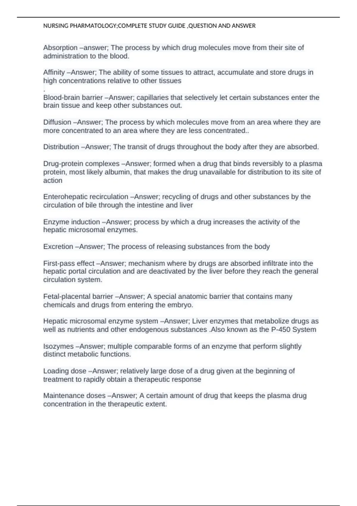 This comprehensive nursing pharmacology study guide provides clear definitions and explanations of essential pharmacological concepts and terminology. It covers drug absorption, distribution, metabolism, excretion, pharmacokinetics, and pharmacodynamics, alongside detailed notes on receptor theory, enzyme systems, therapeutic ranges, and drug interactions. Each term is paired with a concise answer or definition, making it perfect for nursing students preparing for pharmacology exams or clinical practice