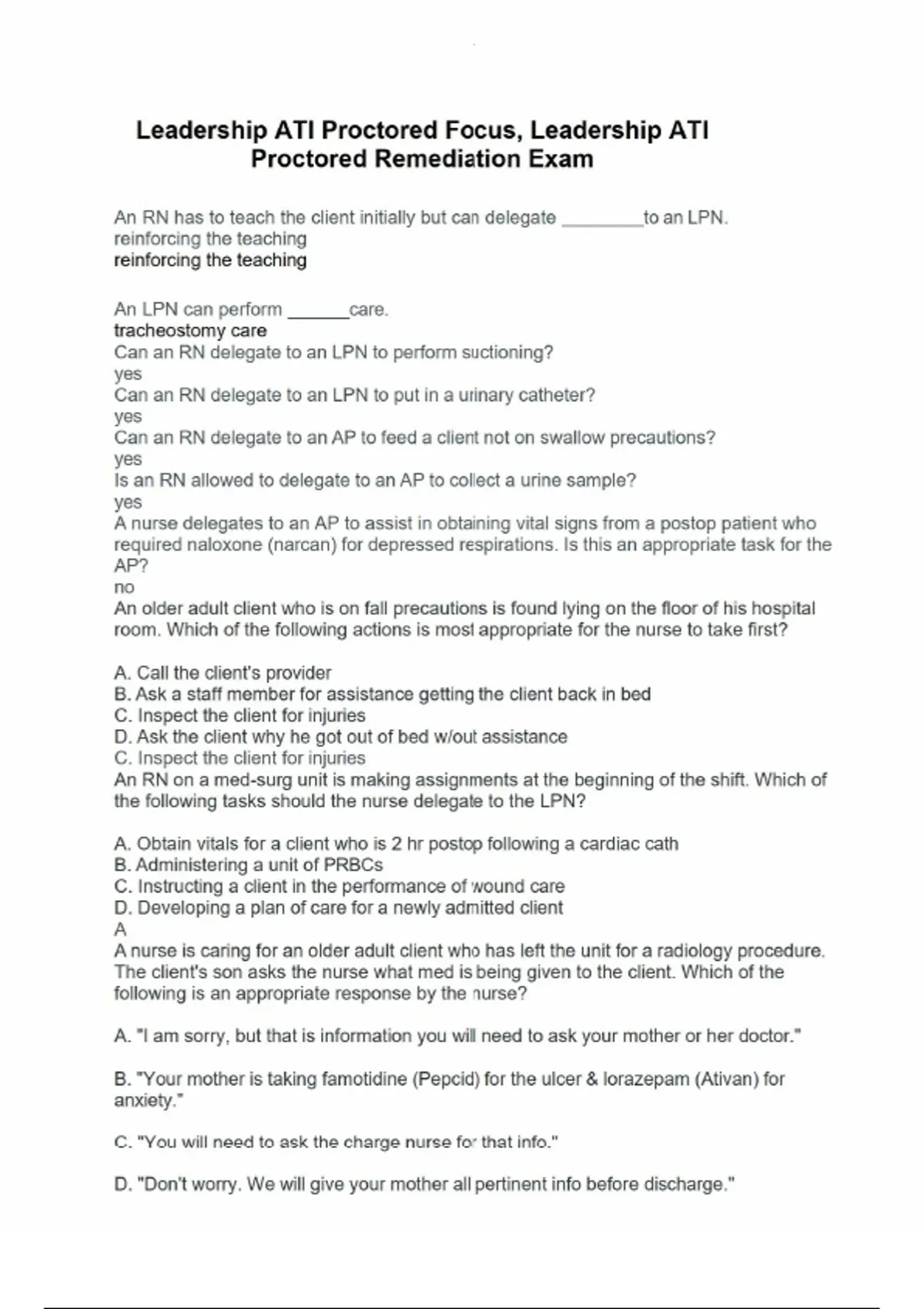 Leadership ATI Proctored Focus, Leadership ATI Proctored Remediation Exam An RN has to teach the client initially but can delegate to an LPN. reinforcing the teaching reinforcing the teaching An LPN can perform care. tracheostomy care Can an RN delegate to an LPN to perform suctioning? yes Can an RN delegate to an LPN to put in a urinary catheter? yes Can an RN delegate to an AP to feed a client not on swallow precautions? yes Is an RN allowed to delegate to an AP to collect a urine sample? yes A nurse delegates to an AP to assist in obtaining vital signs from a postop patient who required naloxone (narcan) for depressed respirations. Is this an appropriate task for the AP? no An older adult client who is on fall precautions is found lying on the floor of his hospital room. Which of the following actions is most appropriate for the nurse to take first? A. Call the client's provider B. Ask a staff member for assistance getting the client back in bed C. Inspect the client for injuries D. Ask the client why he got out of bed w/out assistance C. Inspect the client for injuries An RN on a med-surg unit is making assignments at the beginning of the shift. Which of the following tasks should the nurse delegate to the LPN? A. Obtain vitals for a client who is 2 hr postop following a cardiac cath B. Administering a unit of PRBCs C. Instructing a client in the performance of wound care D. Developing a plan of care for a newly admitted client A A nurse is caring for an older adult client who has left the unit for a radiology procedure. The client's son asks the nurse what med is being given to the client. Which of the following is an appropriate response by the nurse? A. "I am sorry, but that is information you will need to ask your mother or her doctor." B. "Your mother is taking famotidine (Pepcid) for the ulcer & lorazepam (Ativan) for anxiety." C. "You will need to ask the charge nurse for that info." D. "Don't worry. We will give your mother all pertinent info before discharge."A. A nurse works in a mental health facility that uses a case management nursing model to provide care. The nurse should recognize that which of the following describes a case management approach to care? A. A nurse provides total care for several clients B. Collaboration between disciplines creates a multidisciplinary care plan for each client. C. The focus of care is on detecting disorders at an early stage. D. The team leader assigns care for a group of clients B A nurse overhears a client talking with an attorney, reporting physical abuse, use of restraints & denial of meals. What action should the nurse take? A. Report the conversation to the nurse manager to allow for follow-up investigation. B. Question the client about the allegations to identify staff who were allegedly involved. C. Ignore the conversation unless the client brings it to the attention of the nurse. D. Recognize this as a privileged communication that cannot be discussed w/anyone. A A nurse manager is planning a department meeting to discuss client advocacy. Which of the following situations should be included in the discussion? Select all that apply. A. Discussing treatment options w/a client who was pancreatic cancer B. Notifying the surgeon when a client signing a surgical consent form has questions about the procedure C. Helping a client make a list of questions she would like to ask the provider D. Clarifying the dosage of a med prescribed for an older adult client who has impaired liver function E. Carrying out end-of-life wishes outlined in the living will of an older adult B, C, D, E A nurse is assessing a client's negligible progress in following a weight loss program. Which of the following is a likely reason the client was unable to achieve a short-term goal established during the planning phase of the nursing process? A. The goals were realistic & formulated w/client input. B. The underlying problem behind past weight gain was misidentified. C. The implementation of the plan used flexibility in following the nursing actions D. The nurse obtained objective & subjective data during the assessment. B A nurse has prepared an IM injection for a client who is preoperative, when another client suddenly calls for assistance. The nurse asks an LPN to give the injection since an AP is waiting to take the client to surgery. Which of the following is an appropriate action by the LPN? A. Prepare a new syringe for the client who is preopB. Give the prepared med to the client who is preop C. Help the client requesting assistance so the nurse can give the prepared injection D. Report this request to the charge nurse C A new charge nurse on a busy surgical unit notes a high degree of tension among the nursing staff. Which of the following should be the initial method used for resolving this issue? A. Work w/the nurses to identify stressors B. Hire additional staff to decrease the work load C. Make relaxation tapes available to staff to help decrease stress D. Reassess the situation after the nurses have become accustomed to the new charge nurse A A nurse on a long-term care unit finds that a client receiving dialysis was administered captopril (capoten), which was not prescribed for the client. In which order should the nurse take the actions listed? Complete an incident report. Contact the risk manager. Instruct the client to call for assistance when getting out of bed. Measure the client's vital signs Notify the provider 1. Measure the client's vitals 2. Instruct the client to call for assistance when getting out of bed 3. Notify provider 4. Complete an incident report 5. Contact the risk manager A nurse is caring for a group of clients on a med surg unit. Which of the following tasks should the nurse delegate to the assistive personnel (AP)? Select all that apply. A. Collecting a stool specimen B. Providing instructions about using a spirometer C. Measuring oral intake D. Providing postmortem care E. Changing a dressing A, C, D A nurse on a med sur