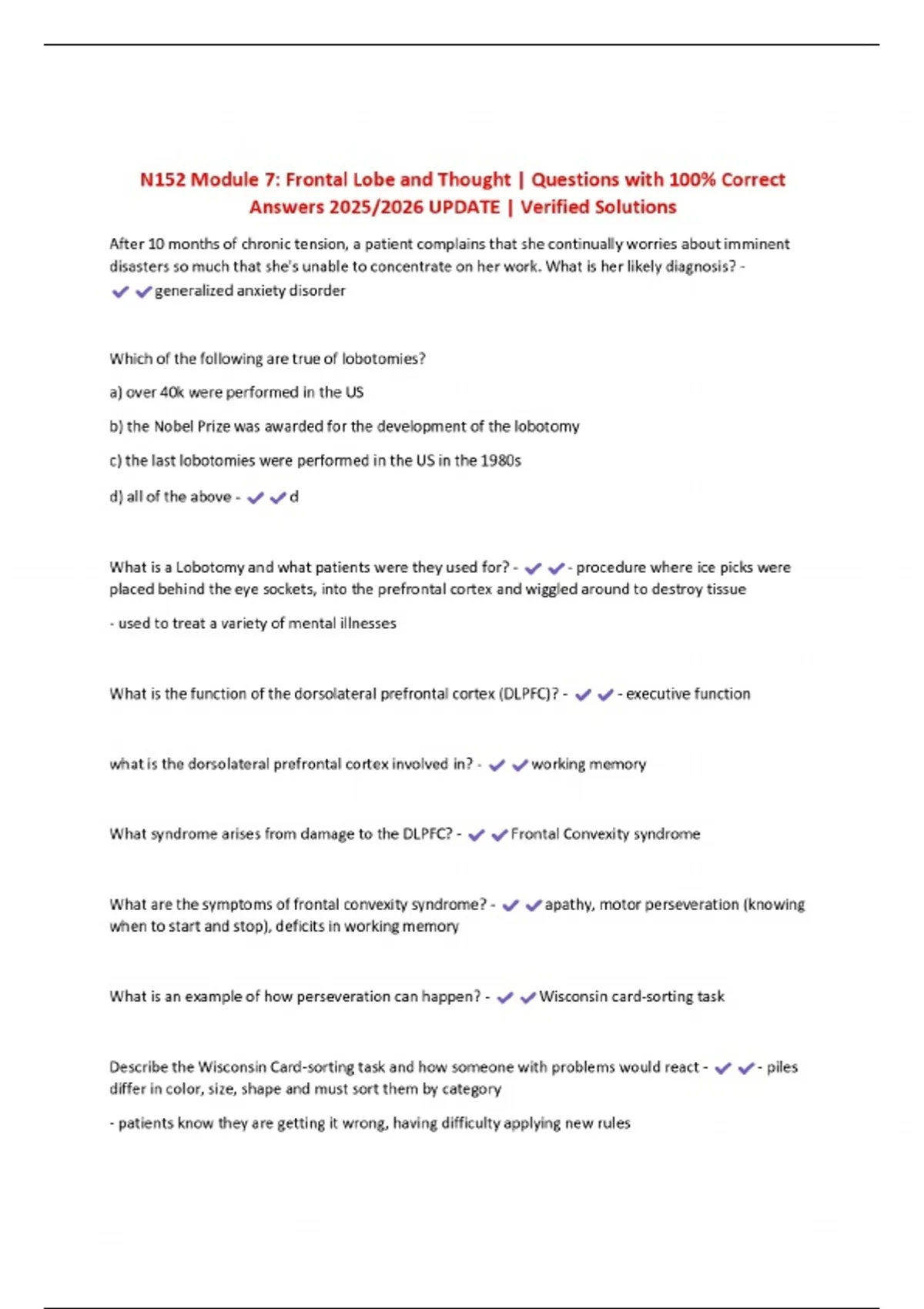 N152 Module 7: Frontal Lobe and Thought | Questions with 100% Correct Answers 2025/2026 UPDATE | Verified Solutions