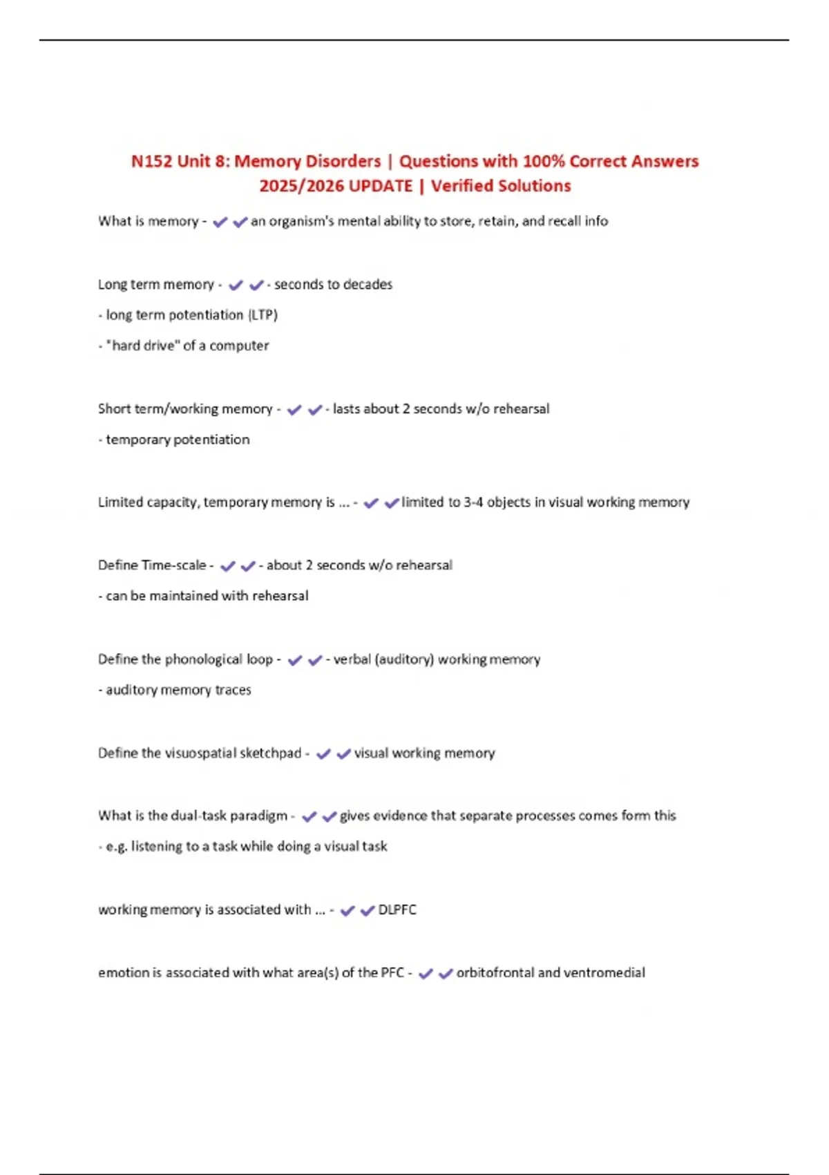 N152 Unit 8: Memory Disorders | Questions with 100% Correct Answers 2025/2026 UPDATE | Verified Solutions