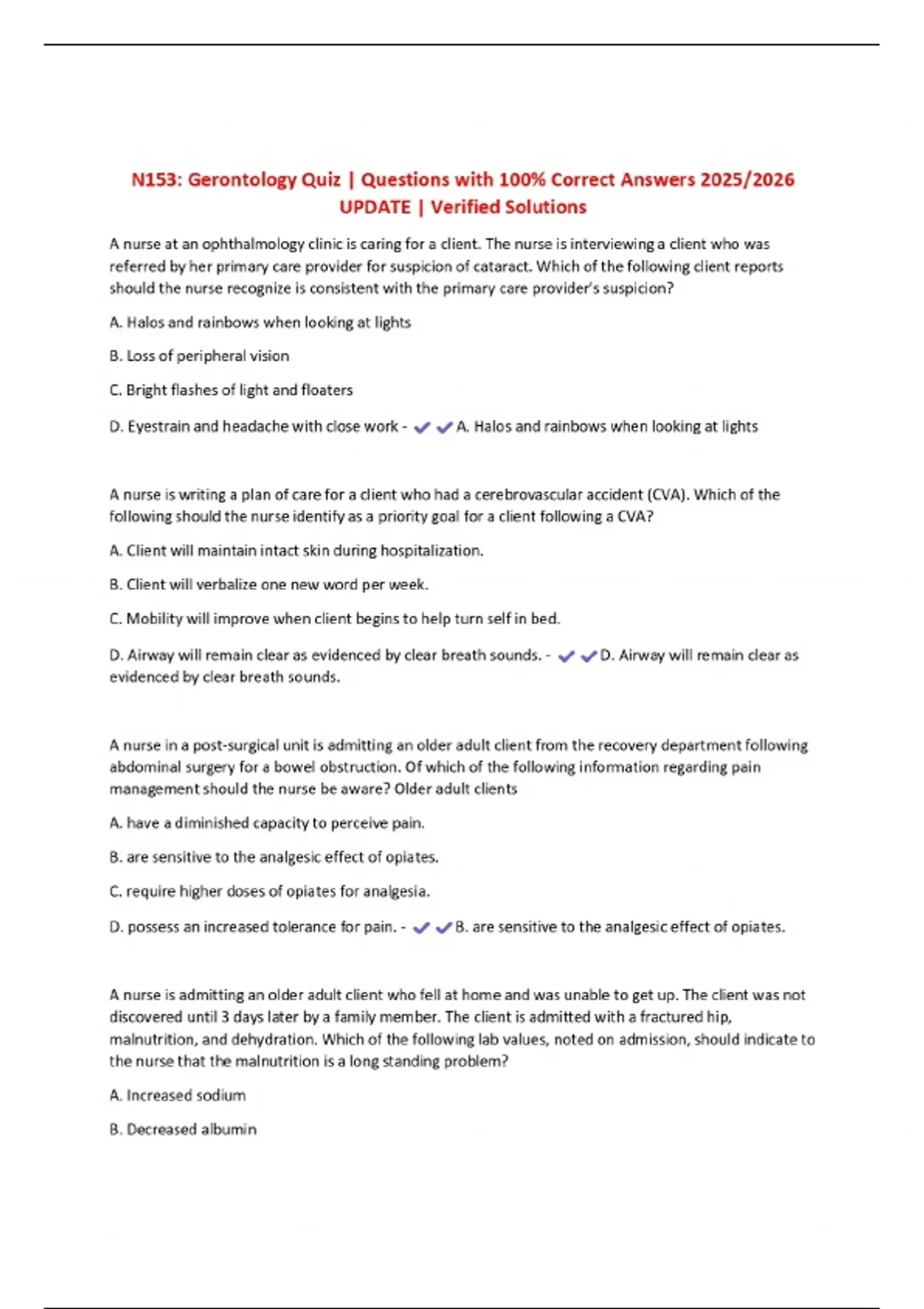 N153: Gerontology Quiz | Questions with 100% Correct Answers 2025/2026 UPDATE | Verified Solutions