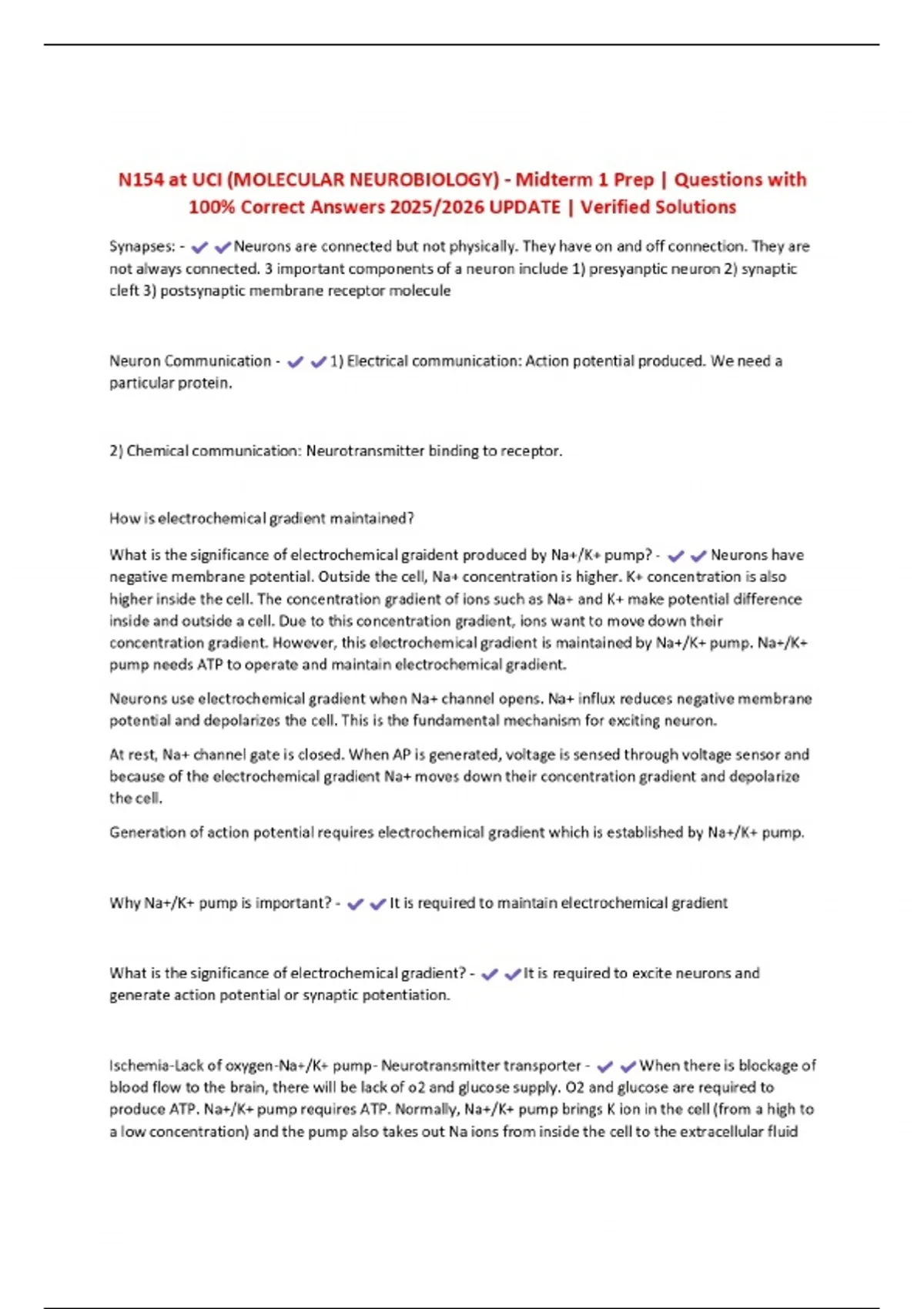 N154 at UCI (MOLECULAR NEUROBIOLOGY) - Midterm 1 Prep | Questions with 100% Correct Answers 2025/2026 UPDATE | Verified Solutions