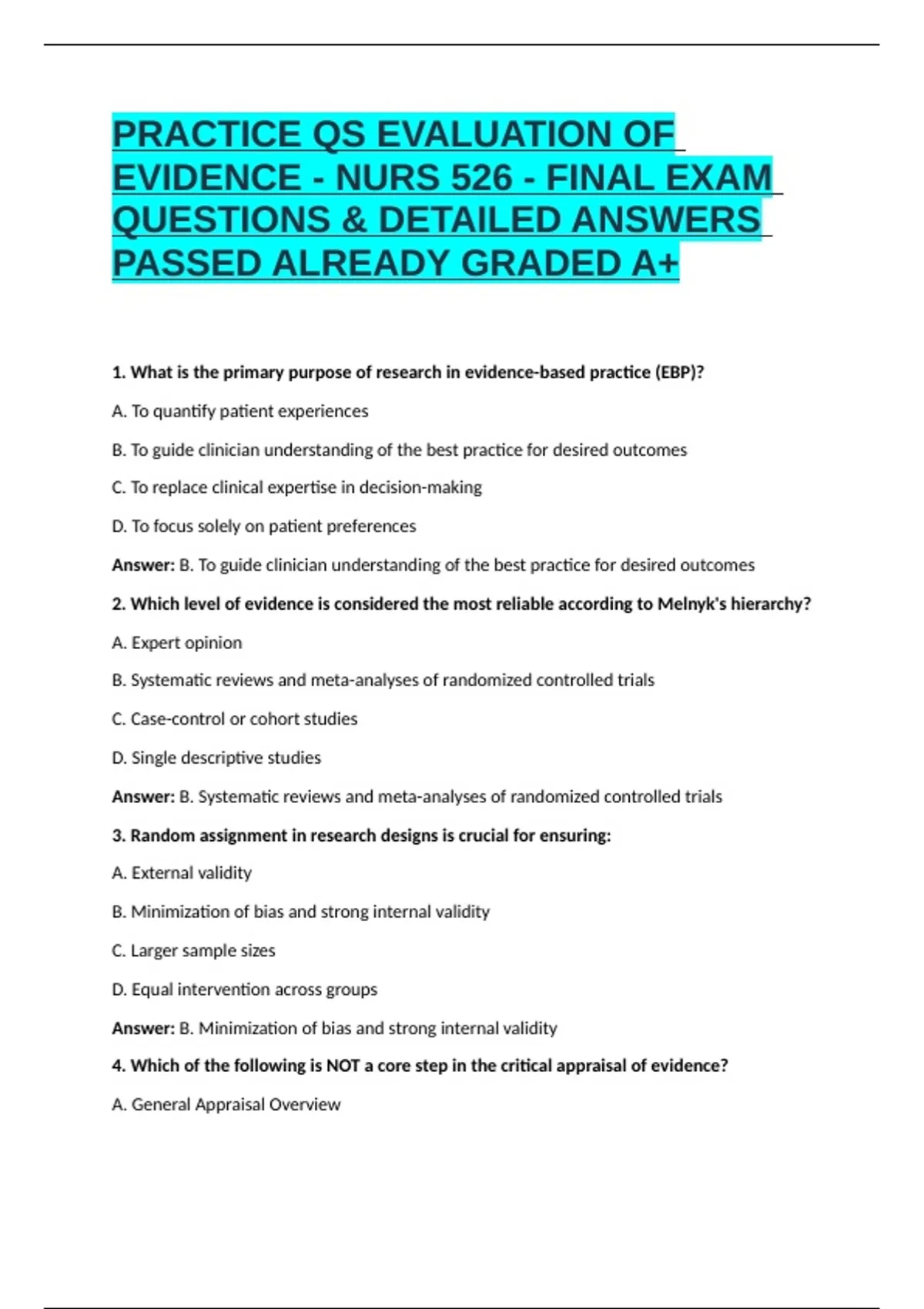PRACTICE QS EVALUATION OF EVIDENCE - NURS 526 - FINAL EXAM QUESTIONS & DETAILED ANSWERS PASSED ALREADY GRADED A+ designed to help nursing students review and prepare for exams in NSG 526, a graduate-level nursing course often focused on Advanced Pathophysiology, Advanced Pharmacology, or Advanced Health Assessment, depending on the program.