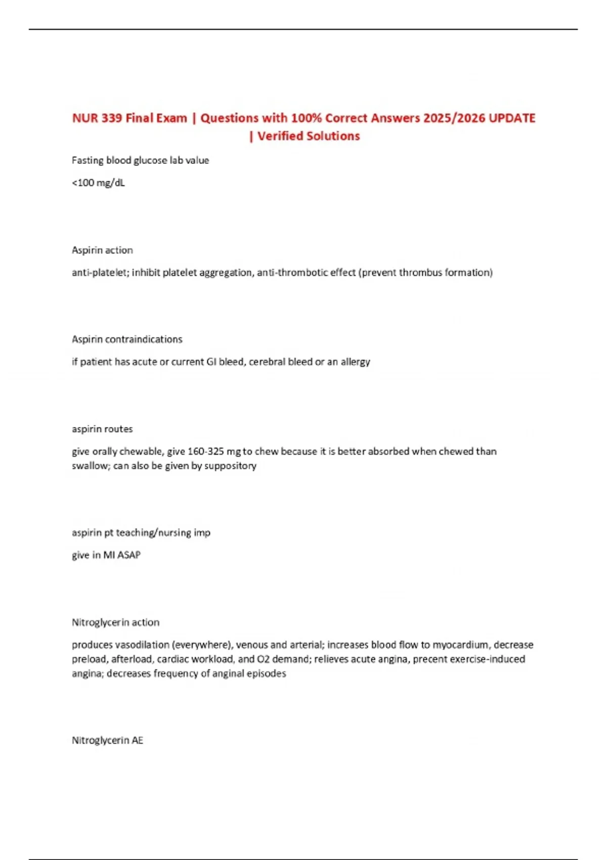 NUR 339 Final Exam | Questions with 100% Correct Answers 2025/2026 UPDATE | Verified Solutions