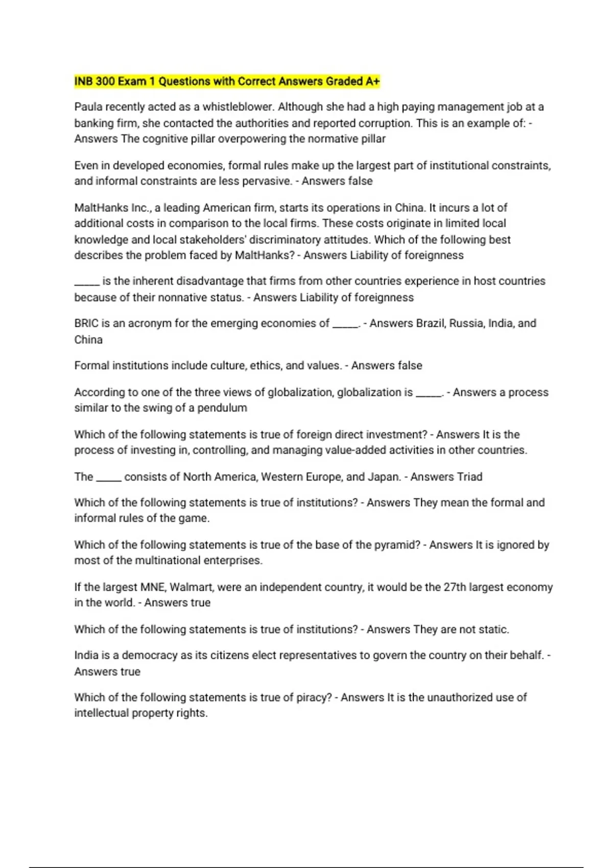 INB 300 Exam 1 Questions with Correct Answers Graded A+ Paula recently acted as a whistleblower. Although she had a high paying management job at a banking firm, she contacted the authorities and reported corruption. This is an example of: - Answers The cognitive pillar overpowering the normative pillar Even in developed economies, formal rules make up the largest part of institutional constraints, and informal constraints are less pervasive. - Answers false MaltHanks Inc., a leading American firm, starts its operations in China. It incurs a lot of additional costs in comparison to the local firms. These costs originate in limited local knowledge and local stakeholders' discriminatory attitudes. Which of the following best describes the problem faced by MaltHanks? - Answers Liability of foreignness _____ is the inherent disadvantage that firms from other countries experience in host countries because of their nonnative status. - Answers Liability of foreignness BRIC is an acronym for the emerging economies of _____. - Answers Brazil, Russia, India, and China Formal institutions include culture, ethics, and values. - Answers false According to one of the three views of globalization, globalization is _____. - Answers a process similar to the swing of a pendulum Which of the following statements is true of foreign direct investment? - Answers It is the process of investing in, controlling, and managing value-added activities in other countries. The _____ consists of North America, Western Europe, and Japan. - Answers Triad Which of the following statements is true of institutions? - Answers They mean the formal and informal rules of the game. Which of the following statements is true of the base of the pyramid? - Answers It is ignored by most of the multinational enterprises. If the largest MNE, Walmart, were an independent country, it would be the 27th largest economy in the world. - Answers true Which of the following statements is true of institutions? - Answers They are not static. India is a democracy as its citizens elect representatives to govern the country on their behalf. - Answers true Which of the following statements is true of piracy? - Answers It is the unauthorized use of intellectual property rights. Most IPR violations are perpetrated by organized crime units centered in Asia. - Answers false Arcadia is a country that follows a democratic system of government. Therefore, it can be inferred that: - Answers citizens elect representatives to govern the country on their behalf.
