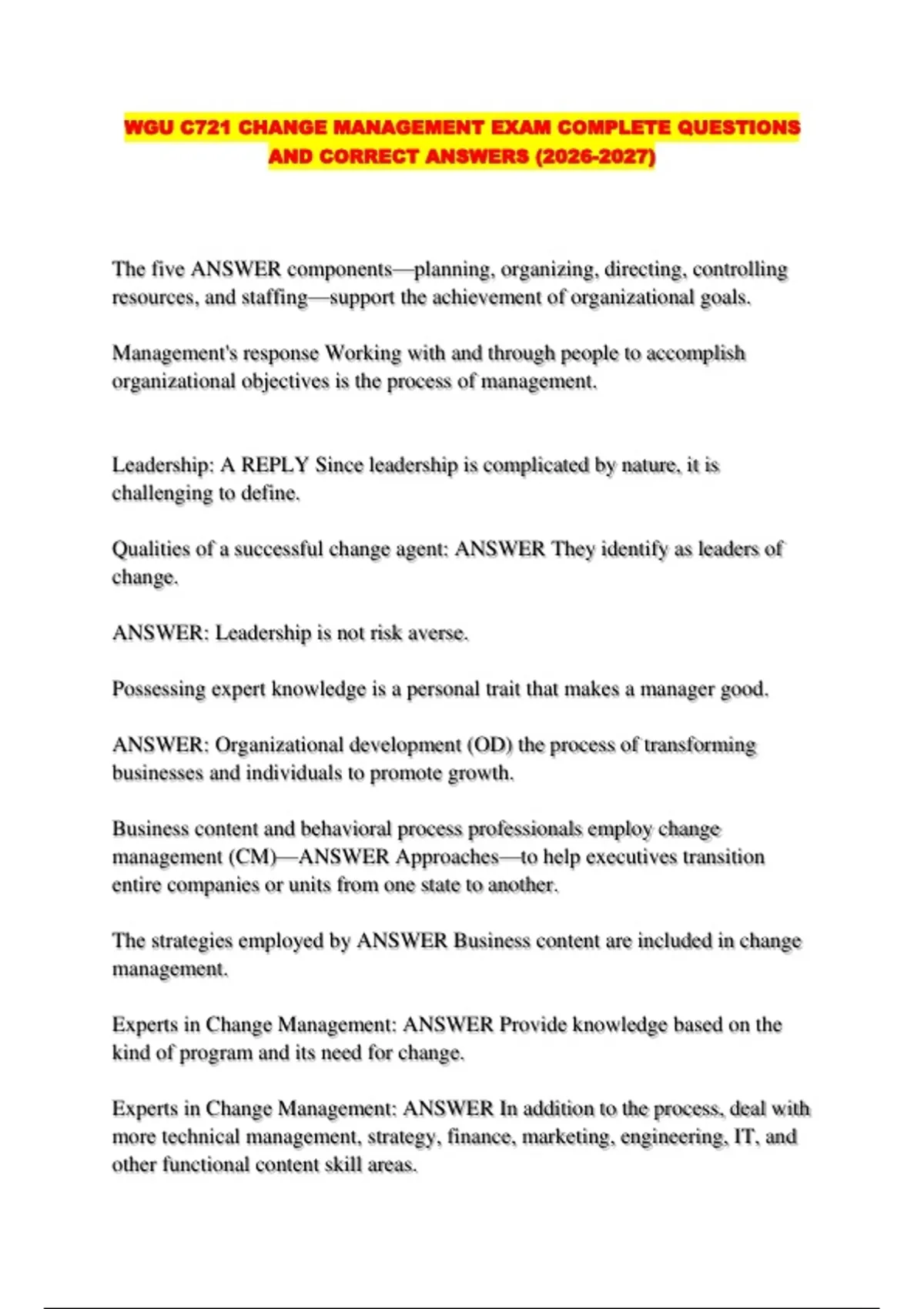 WGU C721 CHANGE MANAGEMENT EXAM COMPLETE QUESTIONS