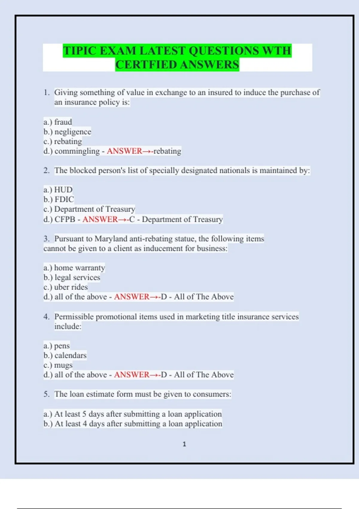 A comprehensive study guide for the Maryland Title Insurance Producer (TIPIC) exam, featuring the latest questions with certified answers. This PDF covers key topics including RESPA regulations, Maryland insurance law, rebating, escrow accounts, licensing requirements, and ethical practices for title professionals.