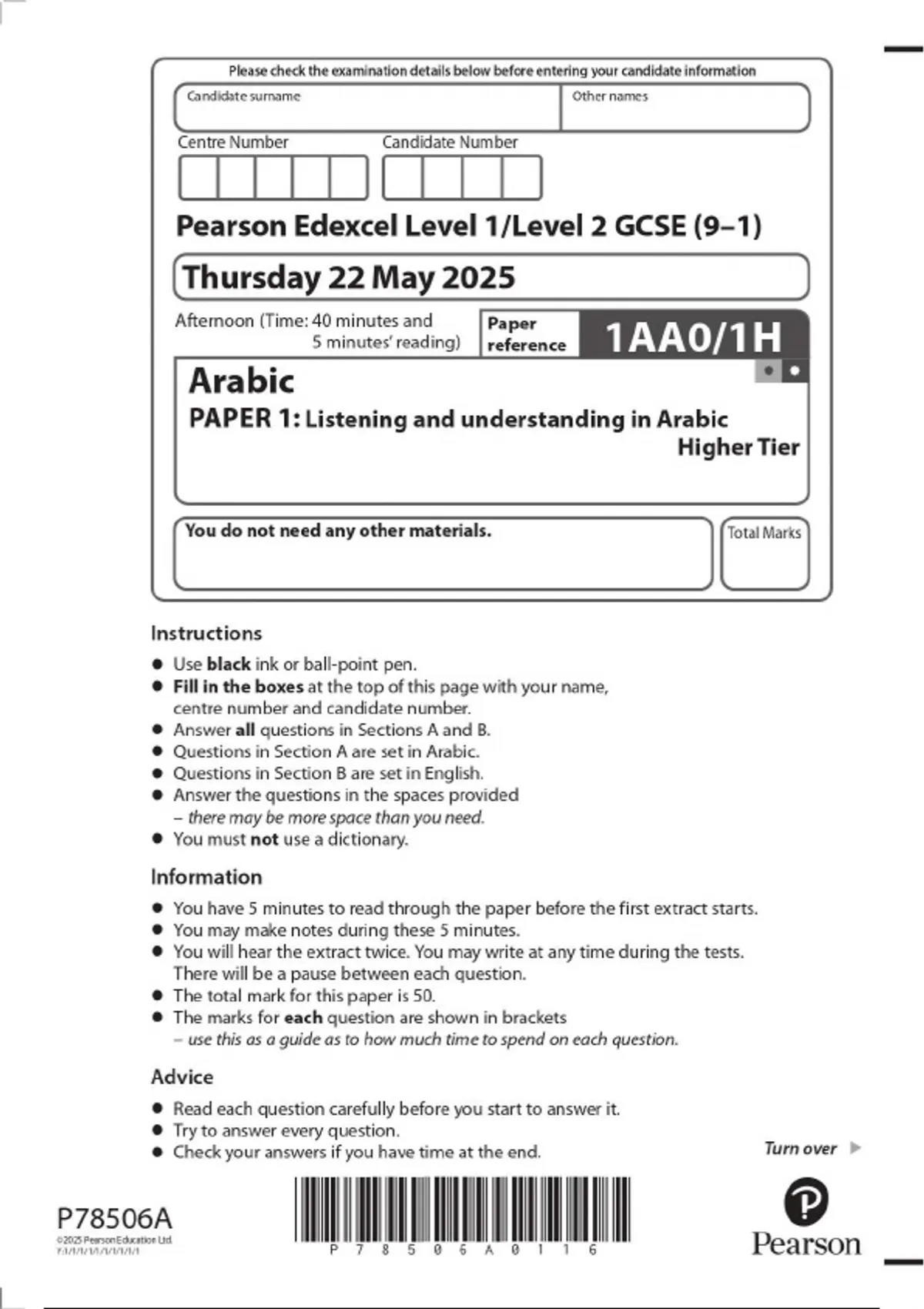 2025 Pearson Edexcel Level 1/Level 2 GCSE. Arabic PAPER 1:1AA0/1H Listening and understanding in Arabic 2025 Pearson Edexcel Level 1/Level 2 GCSE Arabic PAPER 1: 1AA0/1H Listening and understanding in Arabic Higher Tier