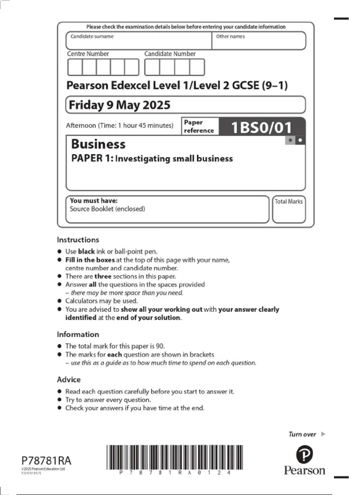 2025 Pearson Edexcel Level 1/Level 2 GCSE. 1BS0/01 Business PAPER 1: Investigating small business 2025 Pearson Edexcel Level 1/Level 2 GCSE. 1BS0/01 Business PAPER 1: Investigating small business