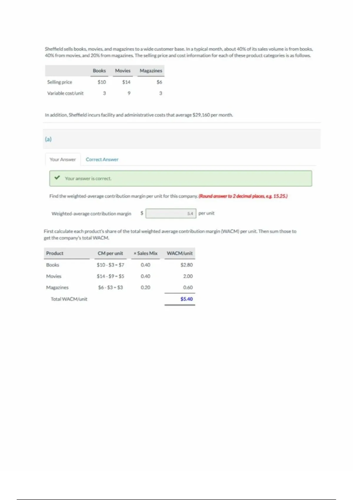 Sales in units to break even = $29,160 + $5.40 = 5,400 units