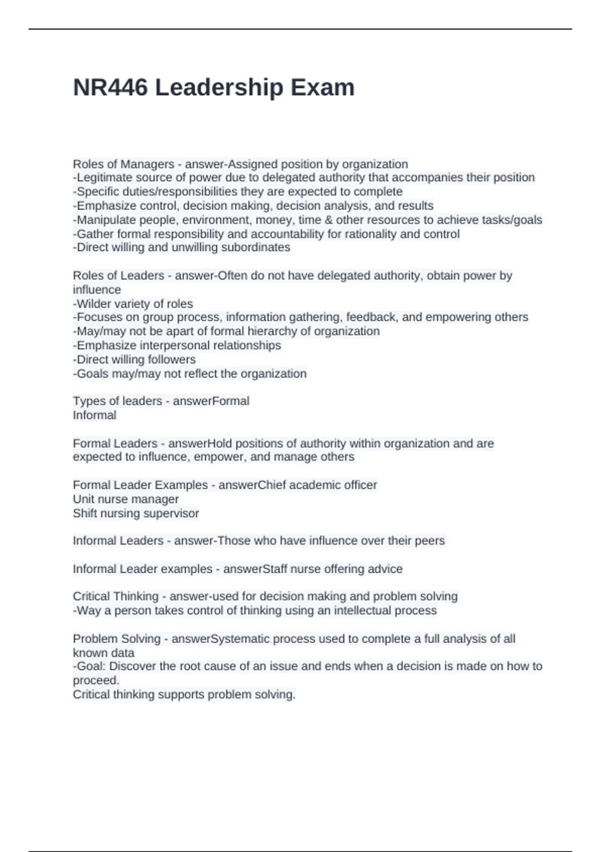 NR446 Leadership Exam