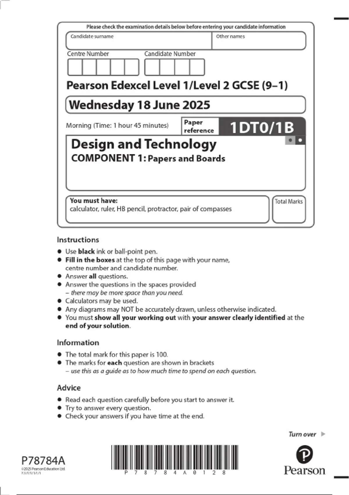 2025 Pearson Edexcel Level 1/Level 2 GCSE (9–1) Design and Technology COMPONENT 1: Papers and Boards 1DT0/1B 2025 Pearson Edexcel Level 1/Level 2 GCSE (9–1) Design and Technology COMPONENT 1: Papers and Boards 1DT0/1B