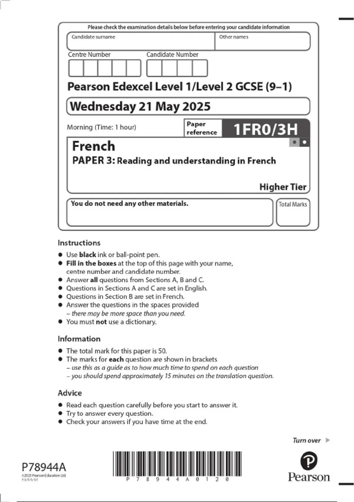 2025 Pearson Edexcel Level 1/Level 2 GCSE (9–1) French PAPER 3: Reading and understanding in French 1FR0/3H 2025 Pearson Edexcel Level 1/Level 2 GCSE (9–1) French PAPER 3: Reading and understanding in French 1FR0/3H2025 Pearson Edexcel Level 1/Level 2 GCSE (9–1) French PAPER 3: Reading and understanding in French 1FR0/3H 2025 Pearson Edexcel Level 1/Level 2 GCSE (9–1) French PAPER 3: Reading and understanding in French 1FR0/3H