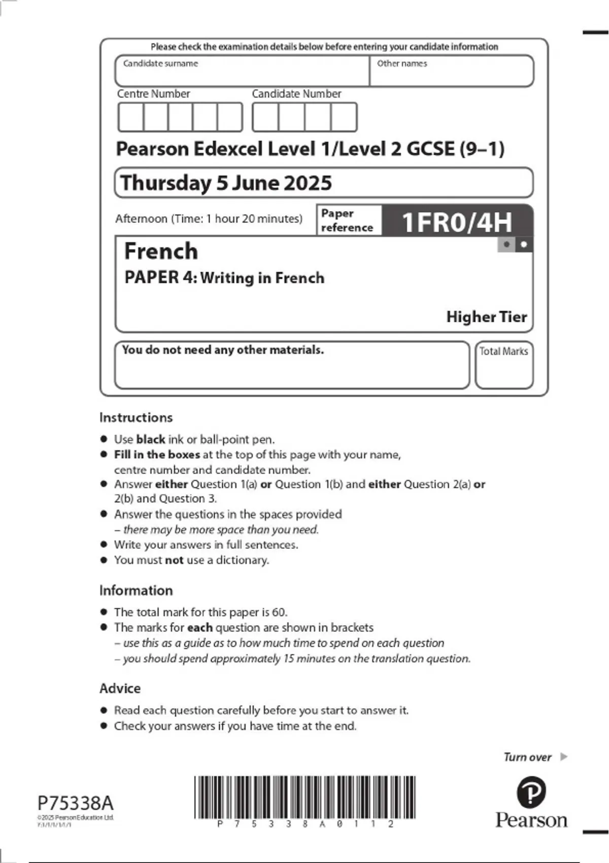 2025 Pearson Edexcel Level 1/Level 2 GCSE (9–1) French PAPER 4: Writing in French 1FR0/4H 2025 Pearson Edexcel Level 1/Level 2 GCSE (9–1) French PAPER 4: Writing in French 1FR0/4H 2025 Pearson Edexcel Level 1/Level 2 GCSE (9–1) French PAPER 4: Writing in French 1FR0/4H 2025 Pearson Edexcel Level 1/Level 2 GCSE (9–1) French PAPER 4: Writing in French 1FR0/4H