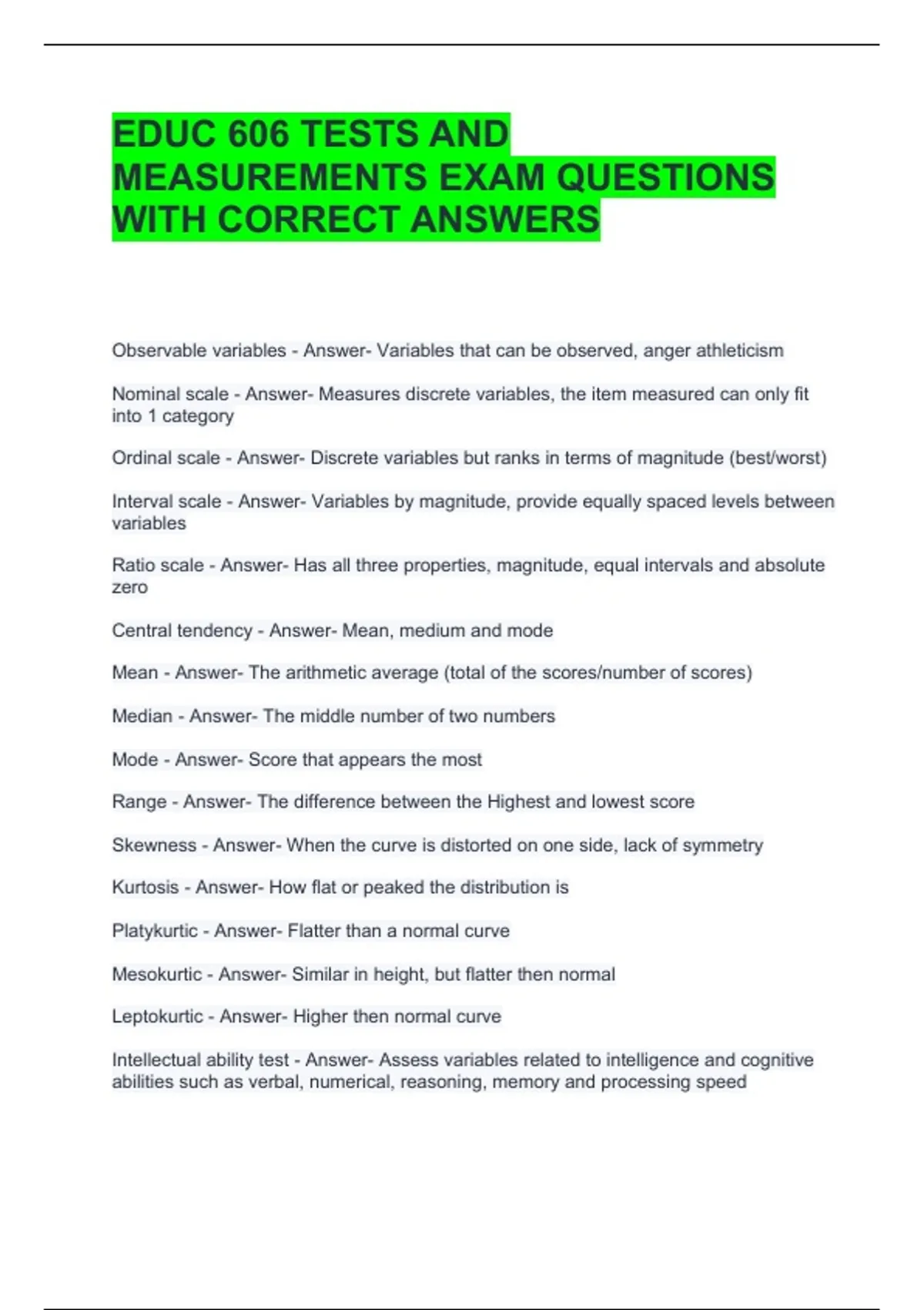 EDUC 606 TESTS AND MEASUREMENTS EXAM QUESTIONS WITH CORRECT ANSWERS
