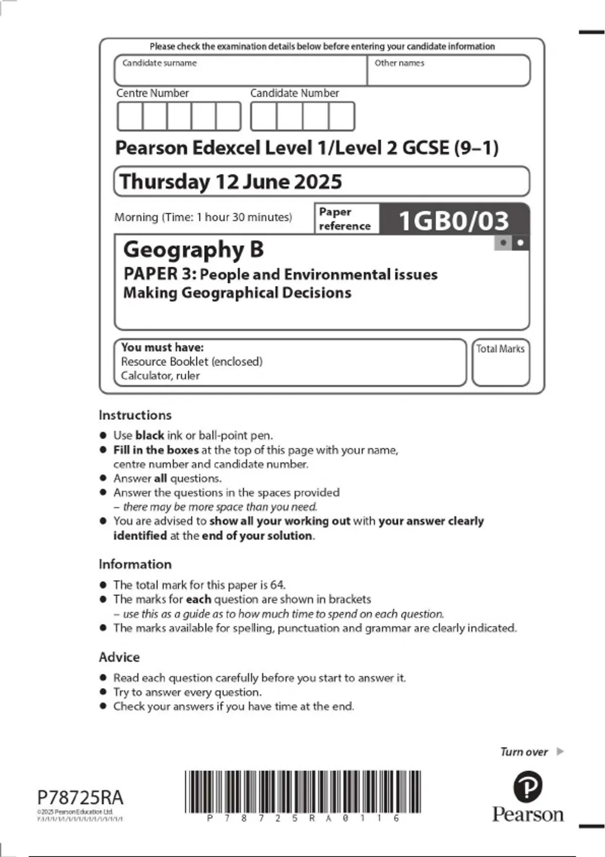 2025 Pearson Edexcel Level 1/Level 2 GCSE (9–1) Geography B PAPER 3: People and Environmental issues Making Geographical Decisions 1GB0/03 2025 Pearson Edexcel Level 1/Level 2 GCSE (9–1) Geography B PAPER 3: People and Environmental issues Making Geog