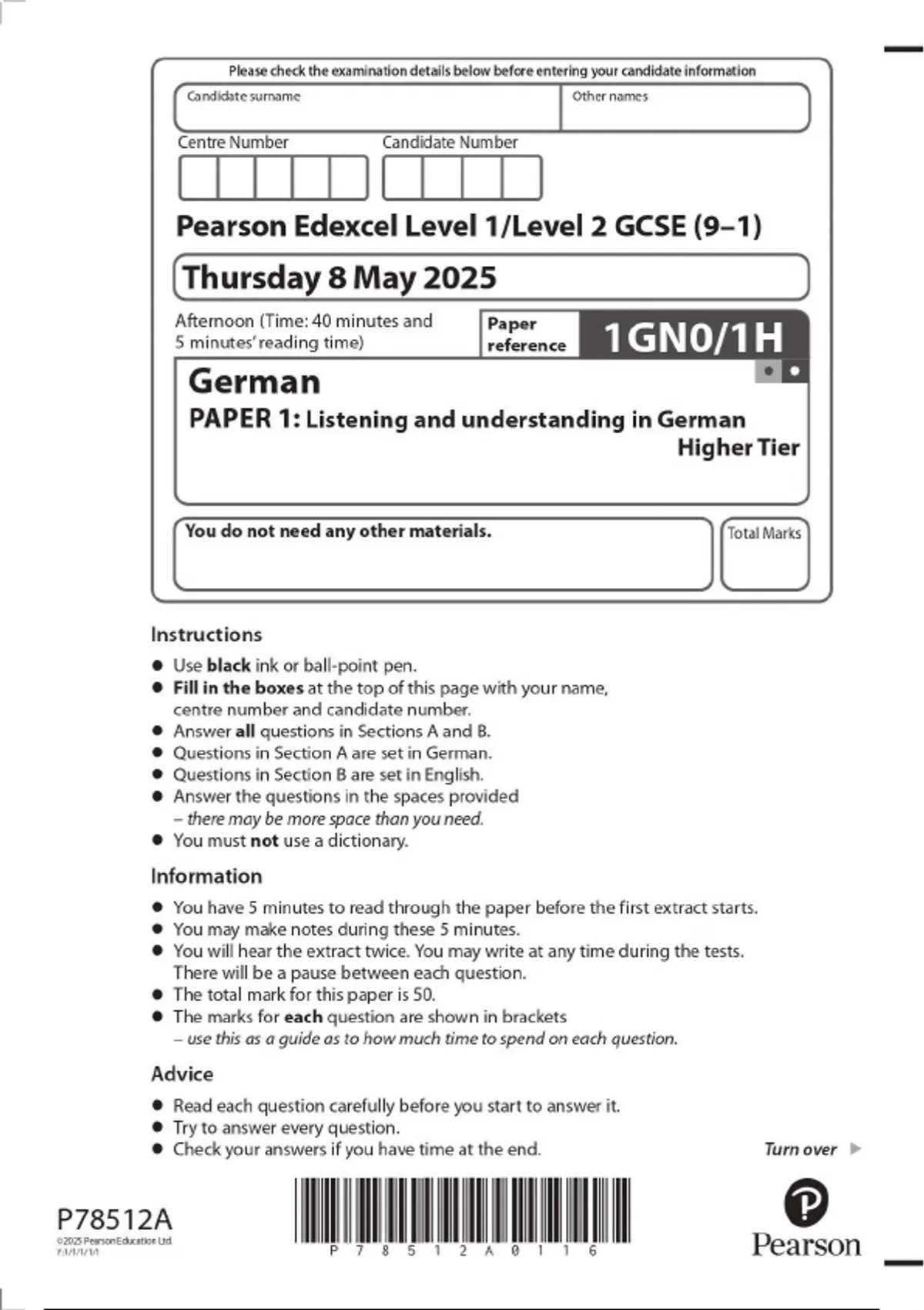 2025 Pearson Edexcel Level 1/Level 2 GCSE (9–1) German PAPER 1: Listening and understanding in German Higher Tier1GN0/1H