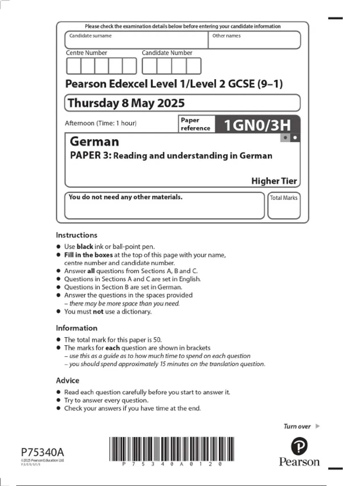 2025 Pearson Edexcel Level 1/Level 2 GCSE (9–1) German PAPER 3: Reading and understanding in German Higher Tier 1GN0/3H