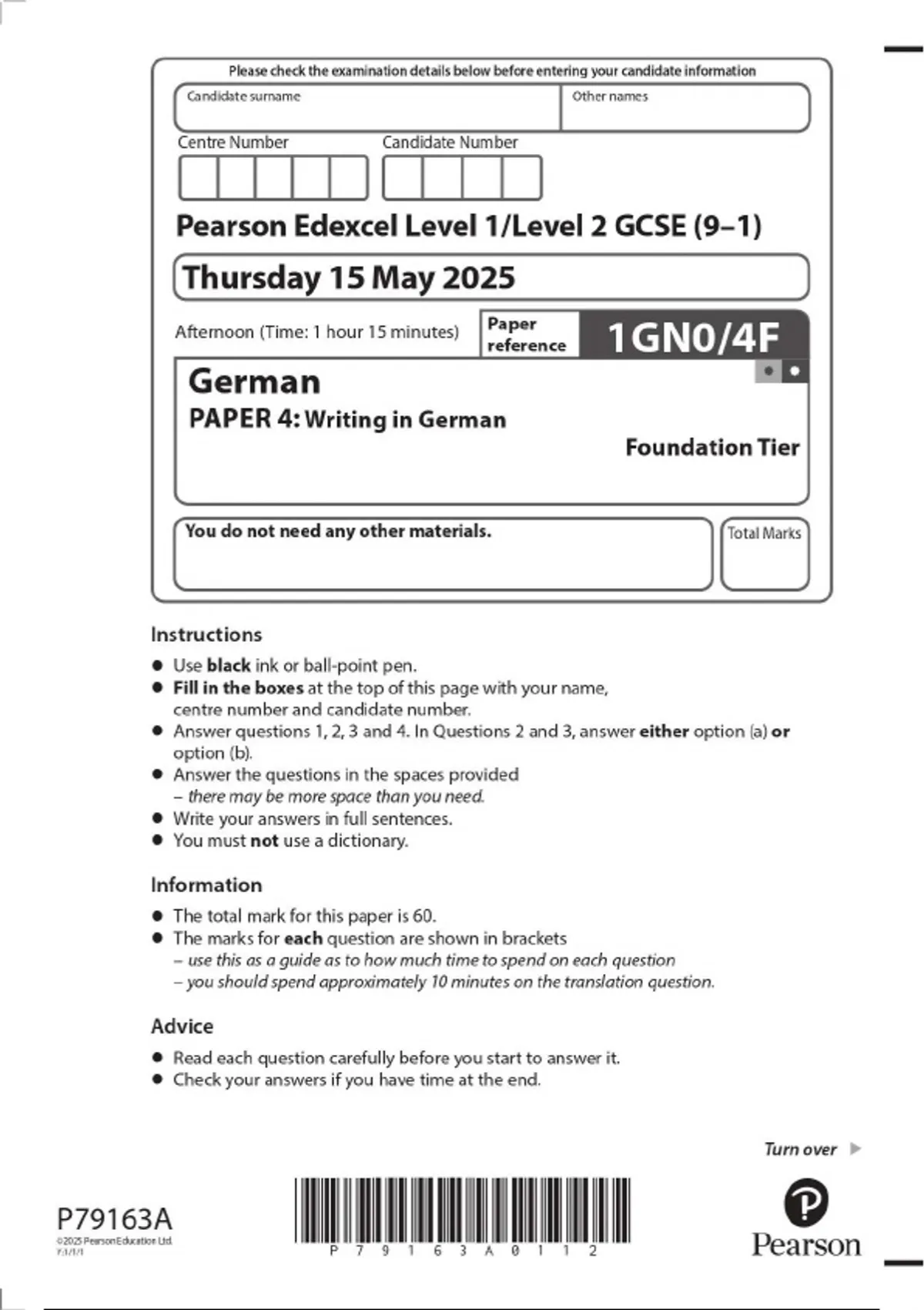 2025 Pearson Edexcel Level 1/Level 2 GCSE (9–1) German PAPER 4: Writing in German Foundation Tier 1GN0/4F