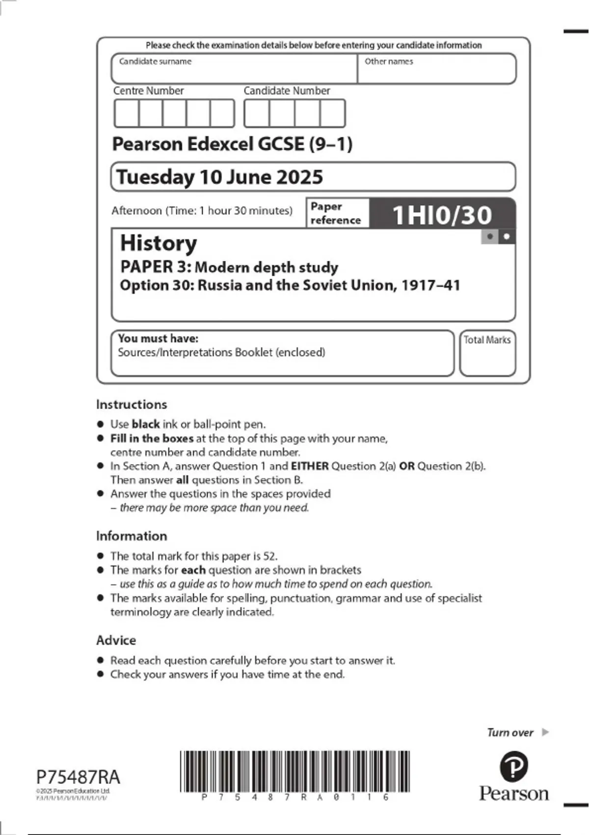 2025 Pearson Edexcel GCSE (9–1) History PAPER 3: 1HI0/30 Modern depth study Option 30: Russia and the Soviet Union, 1917–41. 1HI0/30