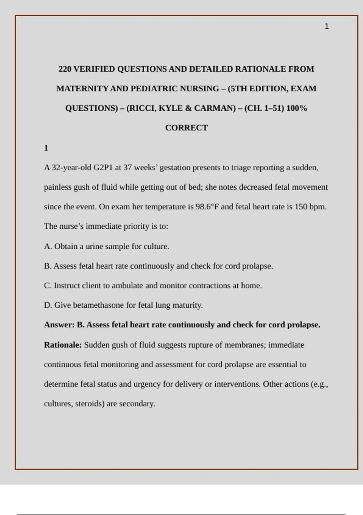 220 VERIFIED QUESTIONS AND DETAILED RATIONALE FROM MATERNITY AND PEDIATRIC NURSING – (5TH EDITION, EXAM QUESTIONS) – (RICCI, KYLE & CARMAN) – (CH. 1–51) 100% CORRECT