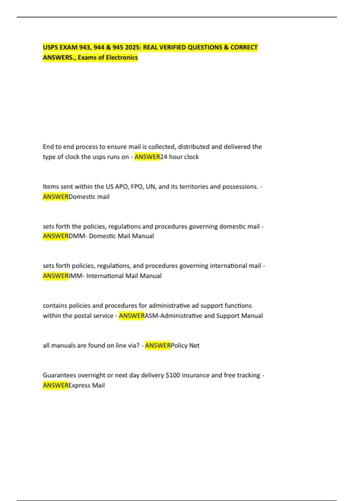 USPS EXAM 943, 944 & 945 2025: REAL VERIFIED QUESTIONS & CORRECT ANSWERS., Exams of Electronics
