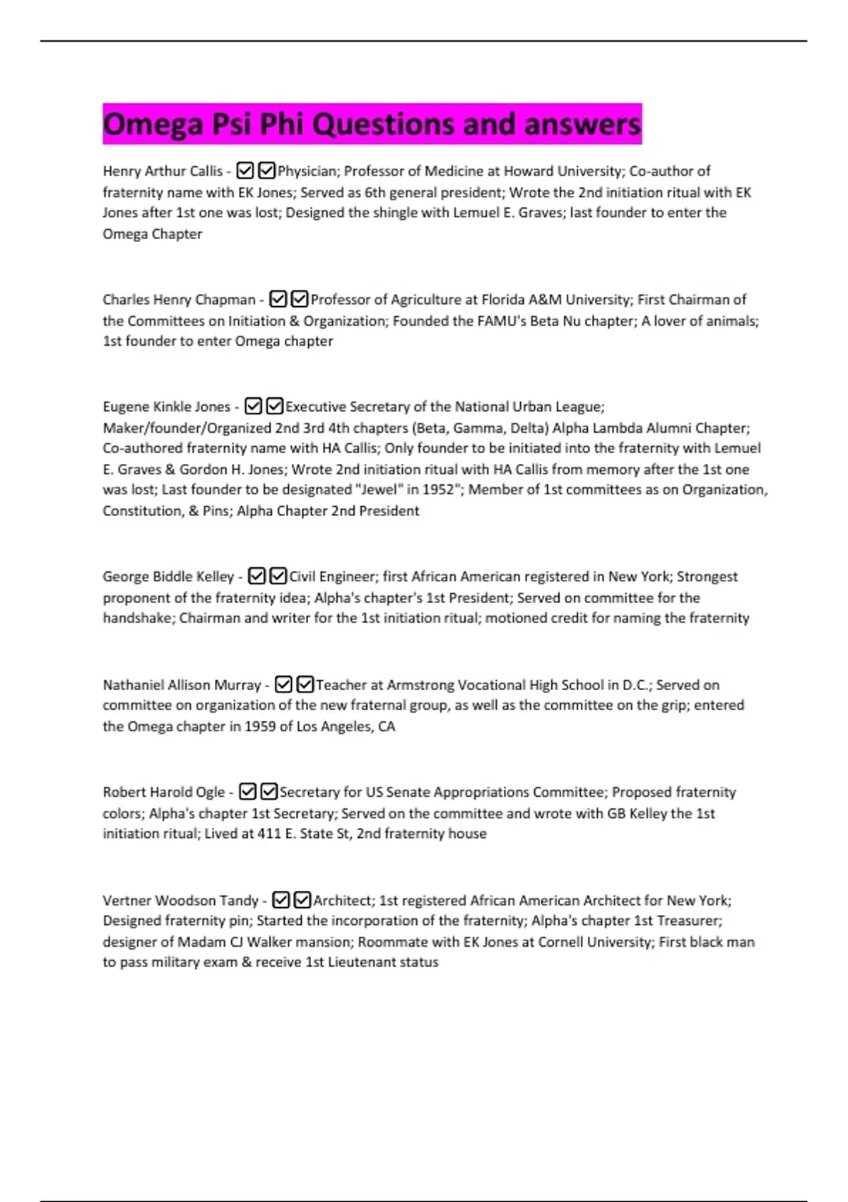 Omega Psi Phi Questions and answers Henry Arthur Callis - Physician; Professor of Medicine at Howard University; Co-author of fraternity name with EK Jones; Served as 6th general president; Wrote the 2nd initiation ritual with EK Jones after 1st one was lost; Designed the shingle with Lemuel E. Graves; last founder to enter the Omega Chapter