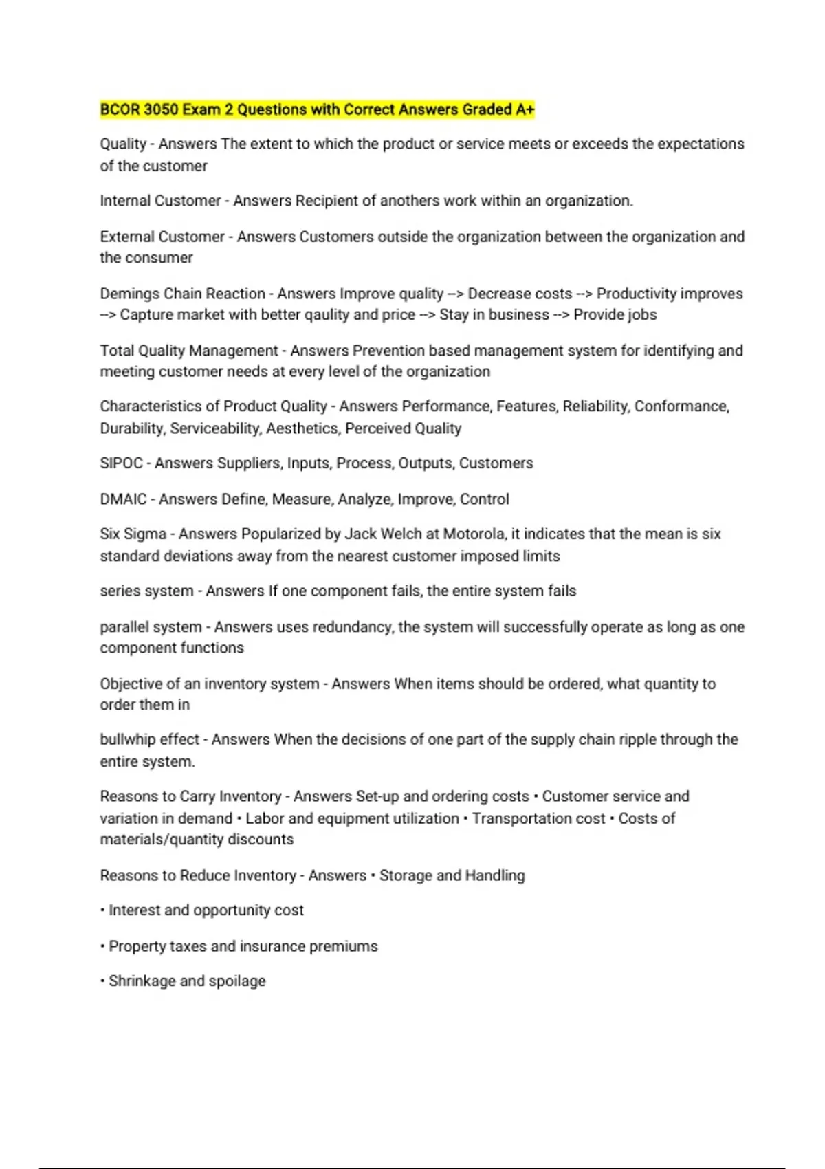 BCOR 3050 Exam 2 Questions with Correct Answers Graded A+ Quality - Answers The extent to which the product or service meets or exceeds the expectations of the customer Internal Customer - Answers Recipient of anothers work within an organization. External Customer - Answers Customers outside the organization between the organization and the consumer Demings Chain Reaction - Answers Improve quality --> Decrease costs --> Productivity improves --> Capture market with better qaulity and price --> Stay in business --> Provide jobs Total Quality Management - Answers Prevention based management system for identifying and meeting customer needs at every level of the organization Characteristics of Product Quality - Answers Performance, Features, Reliability, Conformance, Durability, Serviceability, Aesthetics, Perceived Quality SIPOC - Answers Suppliers, Inputs, Process, Outputs, Customers DMAIC - Answers Define, Measure, Analyze, Improve, Control Six Sigma - Answers Popularized by Jack Welch at Motorola, it indicates that the mean is six standard deviations away from the nearest customer imposed limits series system - Answers If one component fails, the entire system fails parallel system - Answers uses redundancy, the system will successfully operate as long as one component functions Objective of an inventory system - Answers When items should be ordered, what quantity to order them in bullwhip effect - Answers When the decisions of one part of the supply chain ripple through the entire system. Reasons to Carry Inventory - Answers Set-up and ordering costs • Customer service and variation in demand • Labor and equipment utilization • Transportation cost • Costs of materials/quantity discounts Reasons to Reduce Inventory - Answers • Storage and Handling • Interest and opportunity cost • Property taxes and insurance premiums • Shrinkage and spoilage Cycle Inventory - Answers a quantity of inventory that varies in proportion to order quantity Safety Stock Inventory - Answers surplus inventory that a company holds to protect against uncertainties in demand, lead time, and supply Anticipation Inventory - Answers inventory built in anticipation of future demand Pipeline Inventory - Answers inventory that is in the process of moving from one location in the supply chain to another work in process inventory - Answers goods that are partway through the manufacturing process but not yet complete Remanufactured/reconditioned inventory - Answers products that have been used by a customer and then reacquired by a company and either remanufactured or reconditioned for resale Continuous review system - Answers An inventory system used to manage independent demand inventory. The inventory level for an item is constantly monitored, and when the reorder point is reached, an order is released. Periodic review system - Answers an inventory system that has a fixed time between orders but has different order quantities from order to order Economic order quantity - Answers the order quantity that minimizes the total annual cost of ordering and holding inventory for a particular item Lead time - Answers time between when an order is placed and when it is expected to arrive Enterprise Resource Planning - Answers integrated information system that supports most enterprise processes and data storage needs across the entire organization Electronic data interchange - Answers allows companies or units within a company to exchange orders, forecasts, and invoices electronically without human intervention to enter data into the receiving system ABC Systems - Answers Inventory systems that utilize some measure of importance to classify inventory items and allocate control efforts accordingly Bin System - Answers a type of inventory system that uses either one or two bins to hold a quantity of the item being inventoried; an order is placed when one of two bins is empty or a line on a single bin is reached. Can system - Answers reviews the inventory position at fixed time intervals and places orders to bring the inventory up to an expected target level, but only if the inventory position is below a minimum quantity