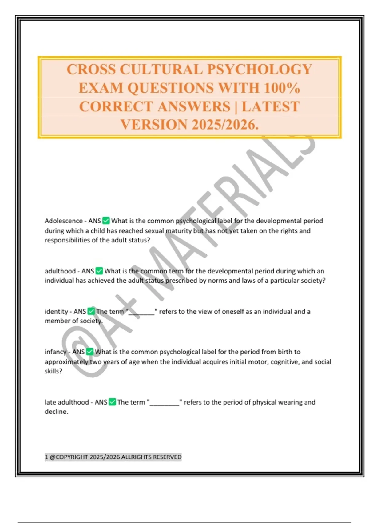 CROSS CULTURAL PSYCHOLOGY EXAM QUESTIONS WITH 100% CORRECT ANSWERS | LATEST VERSION 2025/2026.