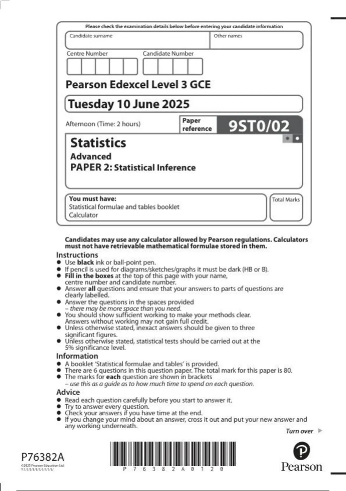Pearson Edexcel a level Statistics |question paper |2025|9ST0/02|