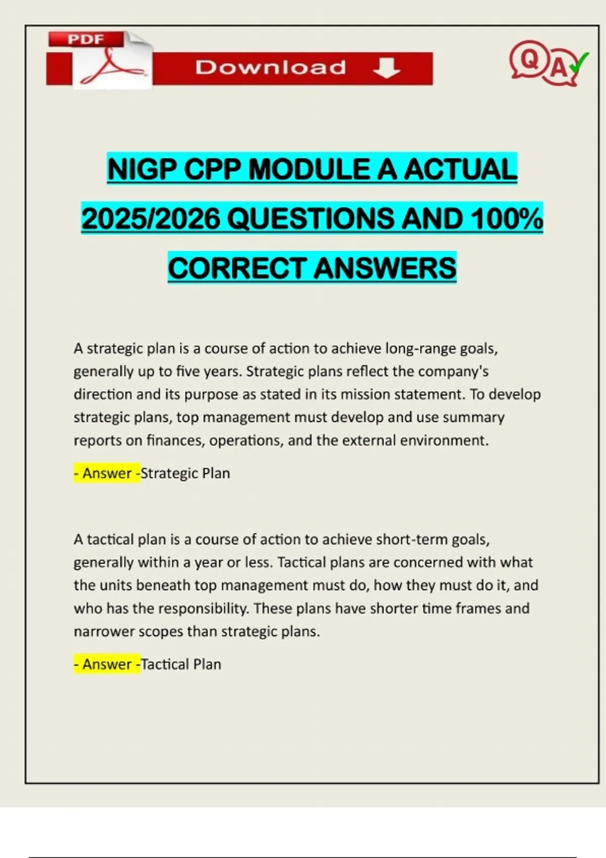 NIGP CPP MODULE A ACTUAL 2025/2026 QUESTIONS AND 100% CORRECT ANSWERS A strategic plan is a course of action to achieve long-range goals, generally up to five years. Strategic plans reflect the company's direction and its purpose as stated in its mission statement. To develop strategic plans, top management must develop and use summary reports on finances, operations, and the external environment. - Answer -Strategic Plan A tactical plan is a course of action to achieve short-term goals, generally within a year or less. Tactical plans are concerned with what the units beneath top management must do, how they must do it, and who has the responsibility. These plans have shorter time frames and narrower scopes than strategic plans. - Answer -Tactical PlanNeed assistance on Online classes, Exams & Assignments? Reach out for instant help!! Full Course Assistance, Plagiarism-free Essay Writing, Research Paper, Dissertation, Discussion Posts, etc…. Confidential & Secure services. Tutors are available for all subjects! Email now at: Obtain the Entity and Departmental (if available) Mission, Goals, and Objectives. Establish and train a Strategic Procurement Planning Team. Review Strengths, Weaknesses, Opportunities, and Threats (SWOT) of the procurement function. Update the Procurement Department's mission, goals, and objectives, if necessary, based on the above SWOT review. Review the projected budget for the entity to determine likely procurements for the coming yea