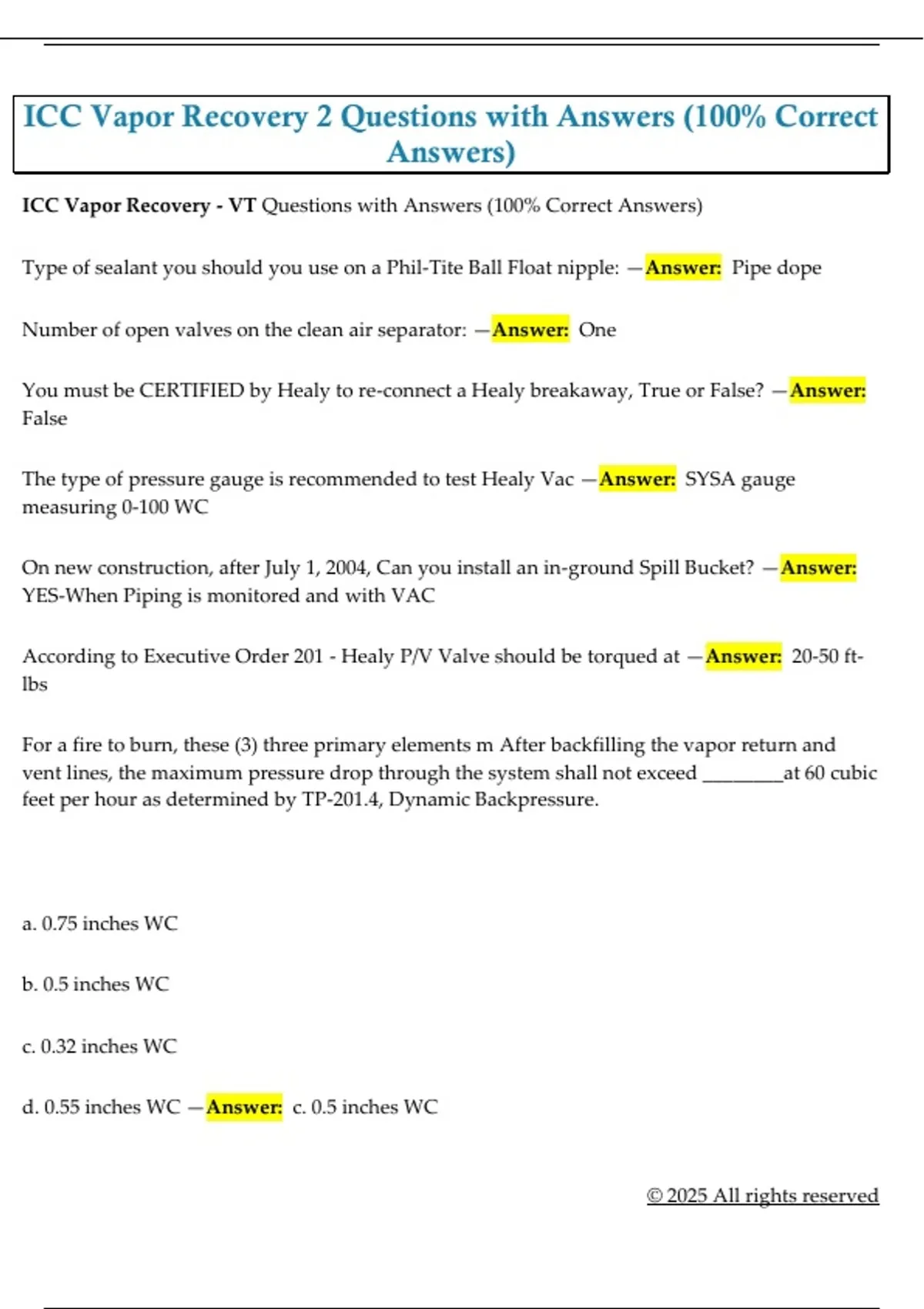 ICC Vapor Recovery 2 Questions with Answers (100% Correct Answers) ICC Vapor Recovery - VT Questions with Answers (100% Correct Answers) Type of sealant you should you use on a Phil-Tite Ball Float nipple: —Answer: Pipe dope Number of open valves on the clean air separator: —Answer: One You must be CERTIFIED by Healy to re-connect a Healy breakaway, True or False? —Answer: False The type of pressure gauge is recommended to test Healy Vac —Answer: SYSA gauge measuring 0-100 WC On new construction, after July 1, 2004, Can you install an in-ground Spill Bucket? —Answer: YES-When Piping is monitored and with VAC According to Executive Order 201 - Healy P/V Valve should be torqued at —Answer: 20-50 ft lbs For a fire to burn, these (3) three primary elements m After backfilling the vapor return and vent lines, the maximum pressure drop through the system shall not exceed ________at 60 cubic feet per hour as determined by TP-201.4, Dynamic Backpressure. a. 0.75 inches WC b. 0.5 inches WC c. 0.32 inches WC d. 0.55 inches WC —Answer: c. 0.5 inches WC