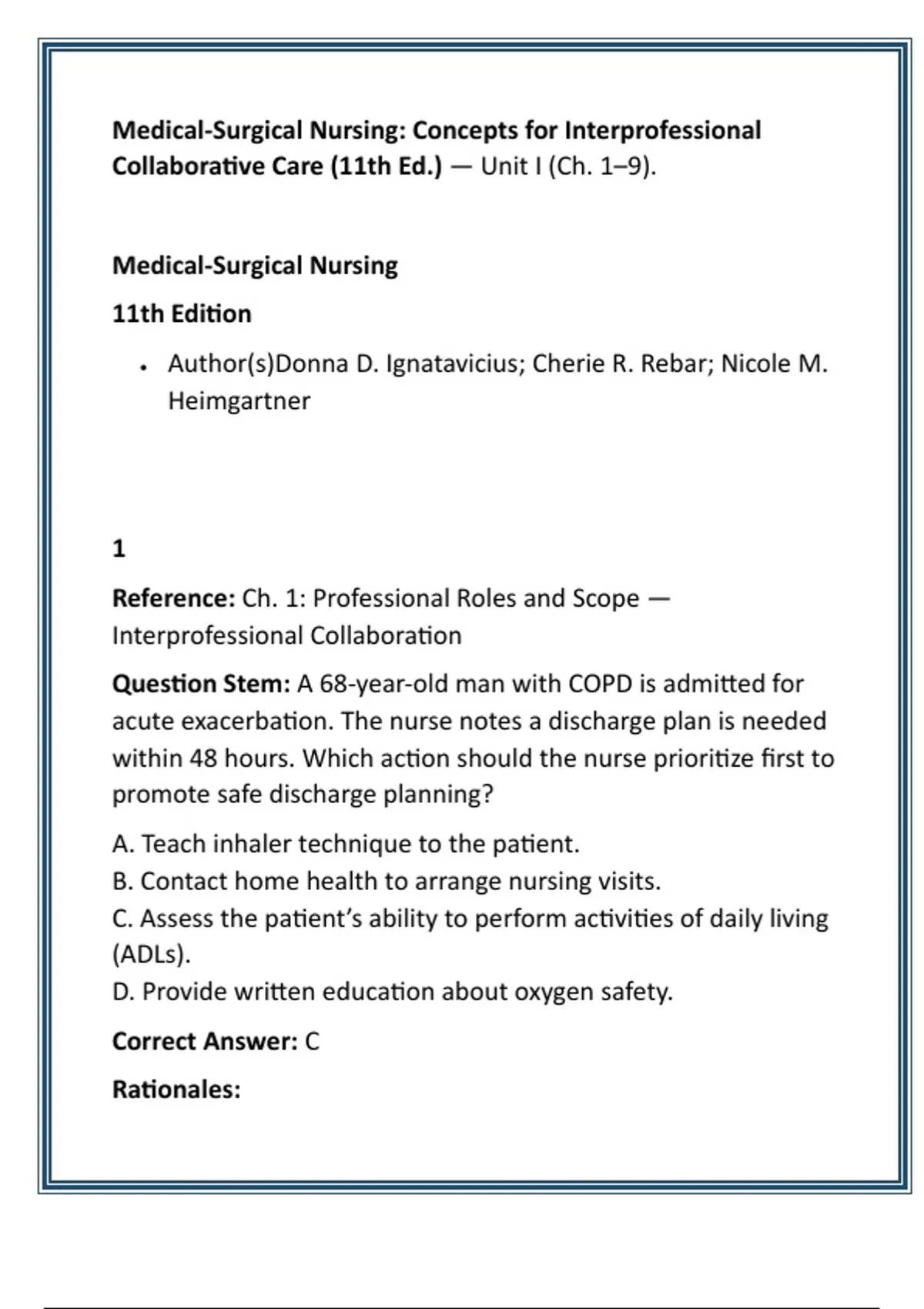 Medical-Surgical Nursing Test Bank (Ignatavicius 11th Edition) — Comprehensive NCLEX/HESI Review: 20 Qs/Chapter, Verified Rationales & Answers Description: Struggling with test anxiety or unsure which med-surg concepts will appear on the NCLEX or HESI? This complete Medical-Surgical Nursing Test Bank—built specifically from Ignatavicius, Rebar, & Heimgartner (11th ed.)—gives you focused, confidence-building practice across the entire textbook. Aligned to the 2025 NCLEX-RN Test Plan and HESI blueprints, every chapter contains 20 original NCLEX/HESI-style MCQs with single-best answers and verified rationales written by experienced nurse-educators. Why this test bank works: • Coverage: 20 rigorously written items per chapter covering pathophysiology, pharmacology, clinical judgment, patient safety, interprofessional care, and the nursing process. • Evidence-based rationales: Each question includes clear, referenced rationales so you learn the “why,” not just the answer. • Exam alignment: Items emphasize clinical reasoning, prioritization, delegation, and safety to mirror NCLEX/HESI cognitive demands. • Versatile use: Ideal for RN/BSN students, MSN review, faculty test banks, and program remediation. • Time-efficient study: Targeted practice sets let you identify weaknesses, track progress, and practice under exam-style conditions. What you’ll gain: Build mastery of medical-surgical care, sharpen clinical judgment, and reduce exam-day stress. Use this resource as your go-to NCLEX review tool—work chapter by chapter, create mixed practice exams, or assign as supplemental study for courses. The combination of comprehensive scope and verified rationales ensures you learn safely, efficiently, and with lasting retention. Primary keywords included for search relevance: Medical-Surgical Nursing Test Bank, Ignatavicius 11th Edition, NCLEX Review, Verified Rationales. Start preparing smarter today—master med-surg concepts with a test bank designed for real exam success. Add to cart and begin focused NCLEX/HESI practice now. Hashtags (10): [#NCLEX #NursingStudents #MedSurgNursing #HESIReview #Ignatavicius11thEdition #NursingSchool #RNExamPrep #TestBank #StudySmarter #NursingEducation] Keywords (20): [Medical Surgical Nursing Test Bank, Ignatavicius 11th Edition questions, NCLEX Med-Surg review, HESI practice questions, verified rationales, nursing exam prep, clinical judgment MCQs, RN study guide, medical surgical care review, evidence-based nursing test bank, MedSurg practice questions, Ignatavicius test bank, NCLEX HESI rationales, nursing test bank download, interprofessional collaborative care test bank, patient safety NCLEX questions, pharmacology med-surg questions, prioritized nursing actions MCQs, board exam med-surg review, best medical surgical test bank]