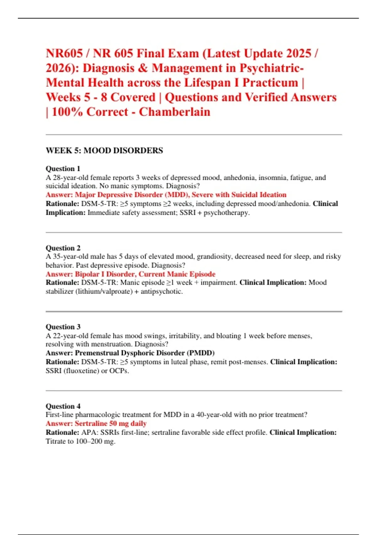 This document features the actual NR 605 Final Exam for the 2025/2026 term at Chamberlain University, covering Diagnosis and Management in Psychiatric-Mental Health Across the Lifespan I Practicum (Weeks 5–8). It includes verified and 100% correct questions with accurate answers, reflecting the most recent course updates. Core content focuses on psychiatric assessment, diagnostic reasoning, treatment planning, psychopharmacology, therapeutic interventions, and case-based clinical management across the lifespan. Each answer is validated for accuracy, providing a comprehensive A-grade exam resource.
