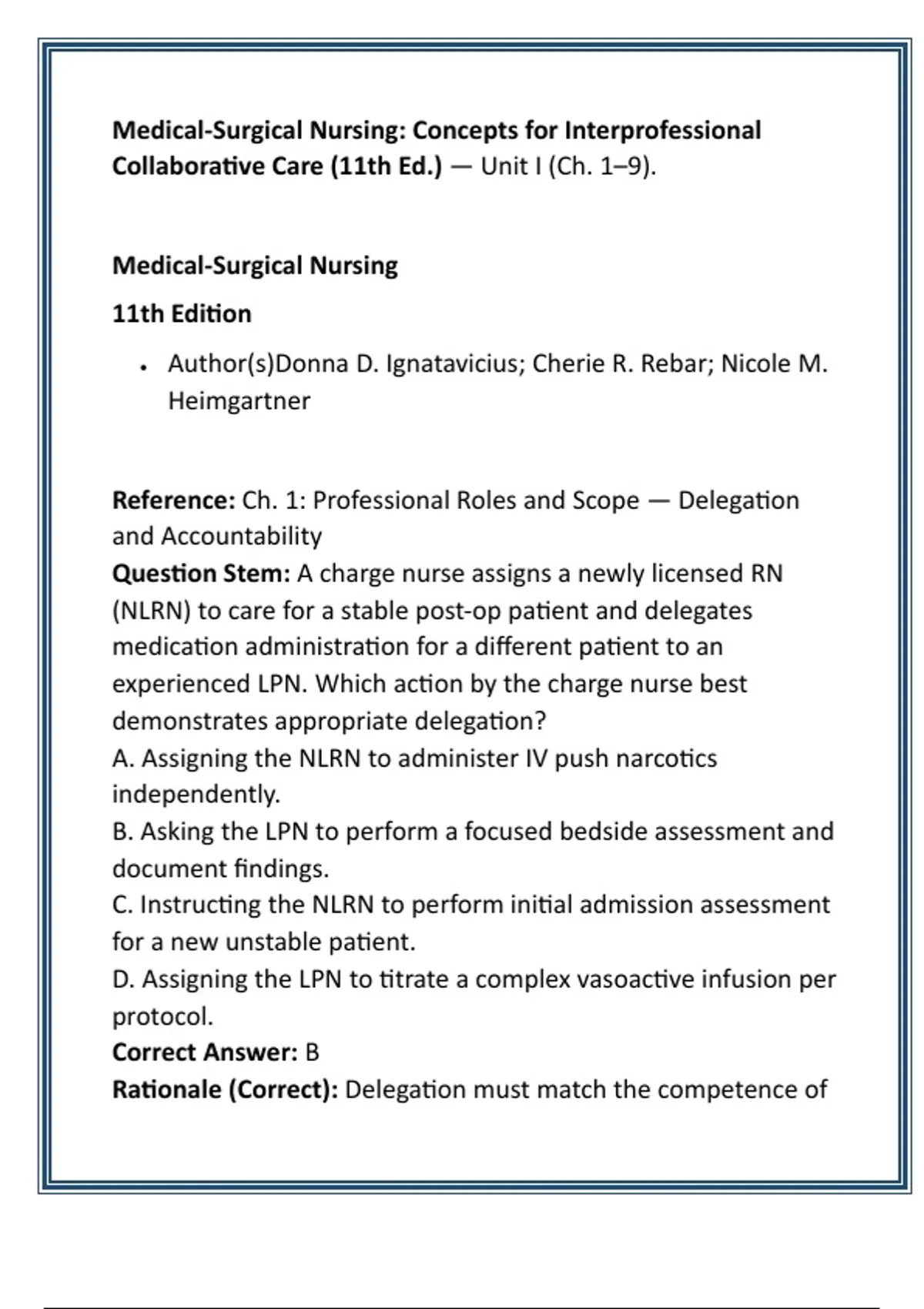 Citation: Ignatavicius et al., 2024, Ch. 1: Delegation and