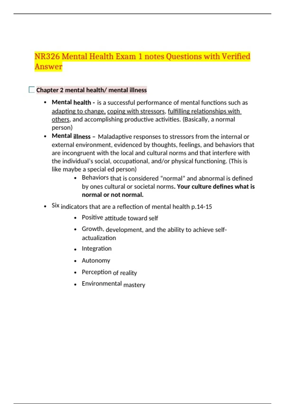 NR326 Mental Health Exam 1 notes Questions with Verified