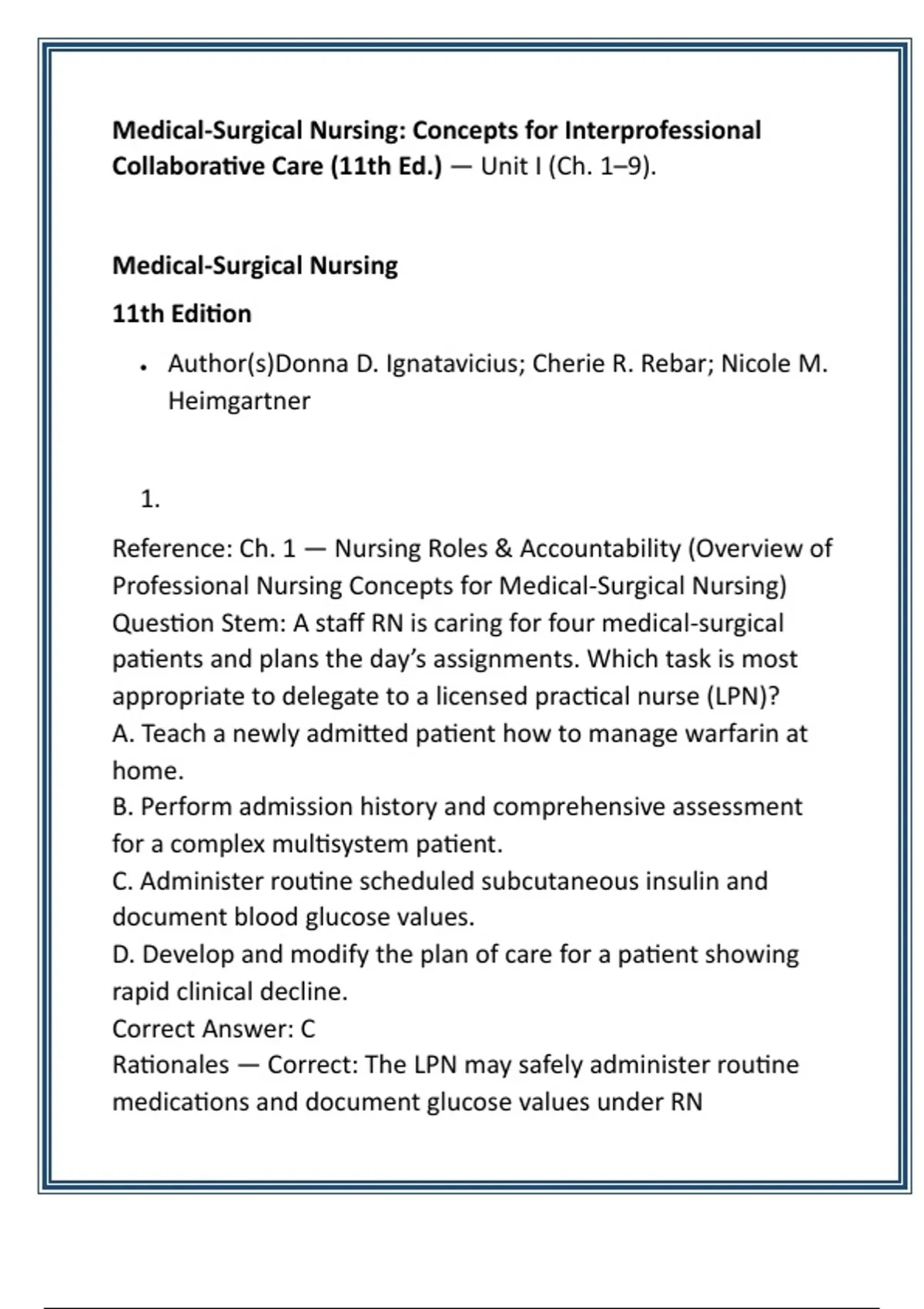 Medical-Surgical Nursing Test Bank (Ignatavicius 11th Edition) — Comprehensive NCLEX & HESI Review | 20 Qs/Chapter, Verified Rationales Description: Struggling with test anxiety or scattered study plans? The Medical-Surgical Nursing Test Bank built specifically for Ignatavicius 11th Edition transforms overwhelmed studying into focused, confidence-building preparation. Aligned with the 2025 NCLEX-RN Test Plan and HESI competencies, this comprehensive NCLEX Review resource delivers clinical-grade practice that mirrors real exam scenarios and course outcomes. Why it works: every chapter contains 20 original NCLEX/HESI-style multiple-choice questions that target clinical judgment, prioritization, and safe, evidence-based medical-surgical care. Each question includes a clearly marked correct answer and verified rationales written and peer-reviewed by nurse educators—so you learn not only what is right, but why other options are wrong. Coverage spans pathophysiology, pharmacology, the nursing process (ADPIE), interprofessional collaboration, patient safety, and practical therapeutic decision-making. Who benefits: RN and BSN students prepping for course exams, RN-to-BSN and MSN learners polishing clinical judgment, and candidates taking NCLEX or HESI exit testing. Educators and clinical instructors can use the bank for quizzes, formative assessments, remediation, and high-quality exam-writing practice. Key features: • 20 NCLEX/HESI-style MCQs per chapter — comprehensive scope and depth. • Verified rationales and concise teaching points — learn faster and retain longer. • Emphasis on clinical judgment, patient safety, and interprofessional collaborative care. • Fully aligned with Ignatavicius 11th Edition content and the 2025 NCLEX-RN Test Plan. • Ready for digital delivery or printable use; ideal for self-study, group review, and classroom integration. Each question is paired with a succinct teaching point and citation mapping back to Ignatavicius content to streamline remediation and curriculum mapping. Educator-reviewed formatting means every item meets psychometric best practices for clarity, plausibility, and single-best-answer construction. Whether you need rapid end-of-course review or a structured study schedule, this test bank integrates seamlessly with study planners and learning management systems. This is more than a question set—it’s a trusted NCLEX Review toolkit and certified study companion that supports mastery learning with verified rationales and evidence-based explanations tailored to medical-surgical practice. Start preparing smarter today—download now and turn targeted practice into NCLEX and HESI success. Hashtags (10): [#NCLEX #NursingStudents #MedSurgNursing #HESIReview #Ignatavicius11thEdition #NursingSchool #RNExamPrep #TestBank #StudySmarter #NursingEducation] Keywords (20): [Medical Surgical Nursing Test Bank, Ignatavicius 11th Edition questions, NCLEX Med-Surg review, HESI practice questions, verified rationales, nursing exam prep, clinical judgment MCQs, RN study guide, medical surgical care review, evidence-based nursing test bank, Ignatavicius test questions, best Med-Surg test bank, NCLEX HESI rationales, Med-Surg practice exam, interprofessional collaborative care study guide, patient safety NCLEX questions, pharmacology Med-Surg questions, 20 questions per chapter test bank, nursing educator test bank, medical-surgical exam bank]