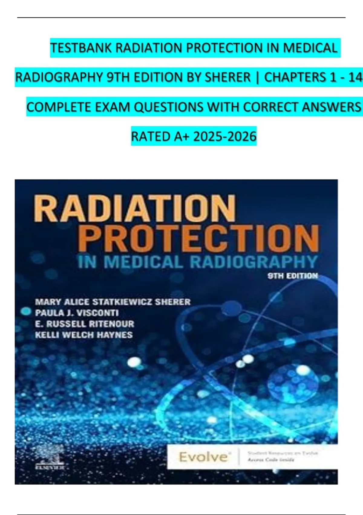 Test Bank For Radiation Protection in Medical Radiography 9th Edition By Mary Alice Statkiewicz Sherer; Paula J. Visconti; E. Russell Ritenour; Kelli Haynes | 9780323825030 | | Chapter 1-16 | All Chapters with Answers and Rationals Introducing the Test Bank for Radiation Protection in Medical Radiography 9th Edition—a crucial resource for aspiring radiography professionals. This test bank is an instant download, encompassing all chapters 1 through 14, ensuring comprehensive coverage of the edition