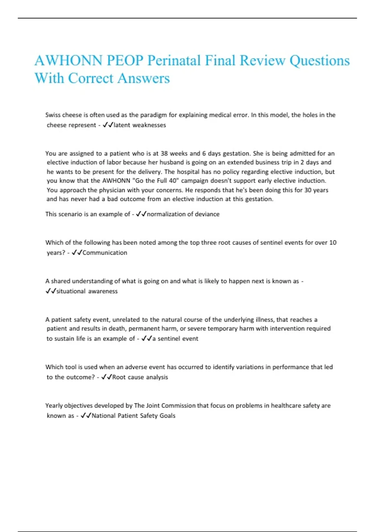 AWHONN PEOP Perinatal Final Review Questions With Correct Answers