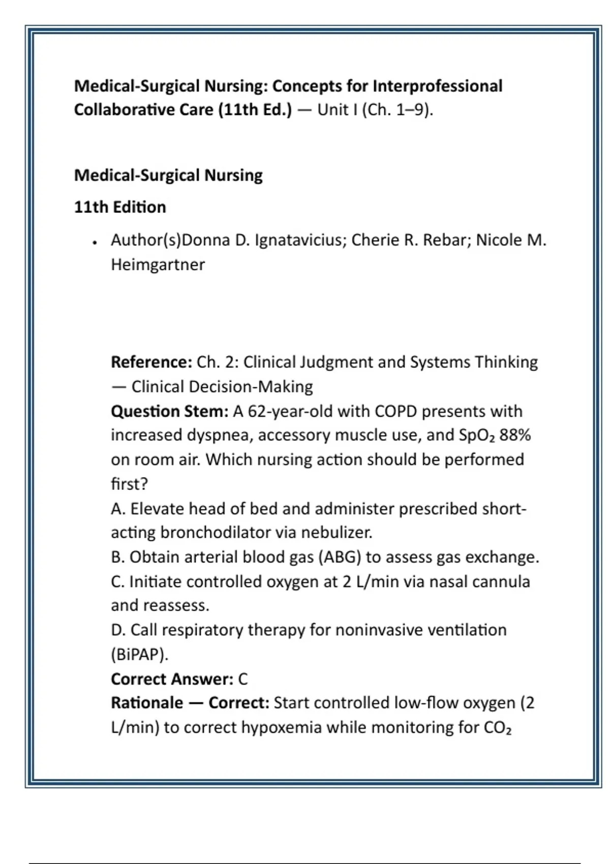 Rationale — Correct: Start controlled low-flow oxygen (2