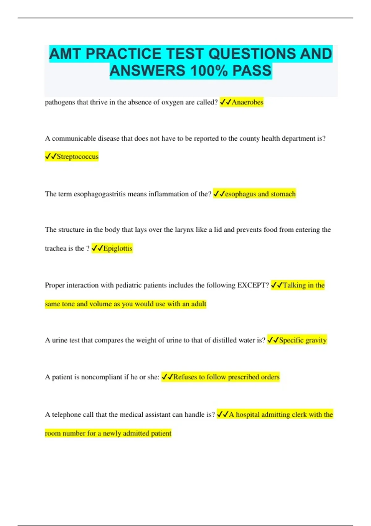 Hey, medical technology students! Gear up to ace your AMT (American Medical Technologists) exam with this 2025/2026 practice test study guide. Loaded with 100% correct questions and answers, it covers essential topics like clinical laboratory procedures, microbiology, hematology, and quality control. Designed for busy students, this guide offers clear explanations and practical insights to help you master key concepts and boost your confidence. Perfect for quick reviews or comprehensive prep, it’s your ticket to passing the AMT exam on your first try. Start studying now and launch your medical tech career!