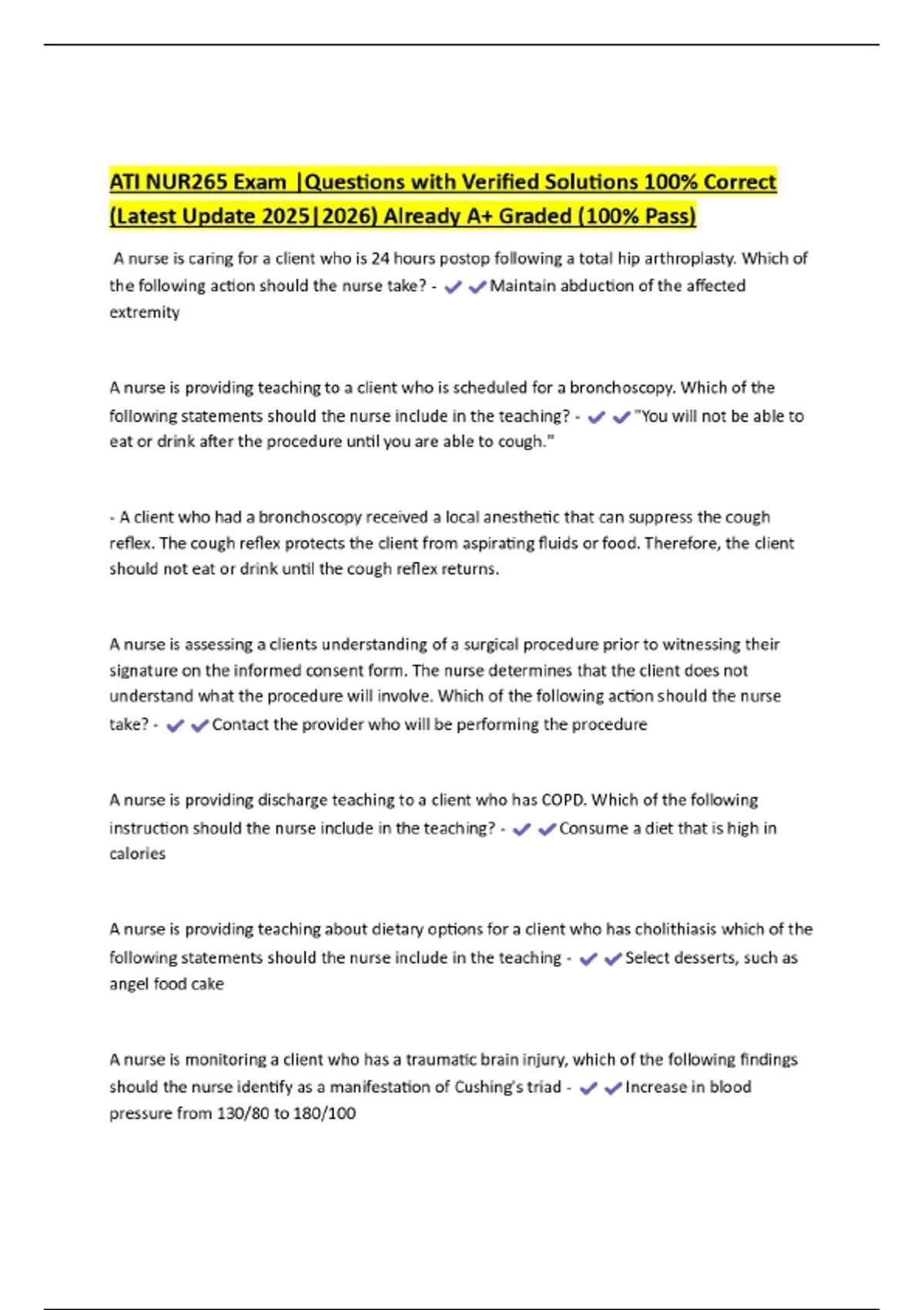 ATI NUR265 Exam |Questions with Verified Solutions 100% Correct (Latest Update 2025|2026) Already A+ Graded (100% Pass)