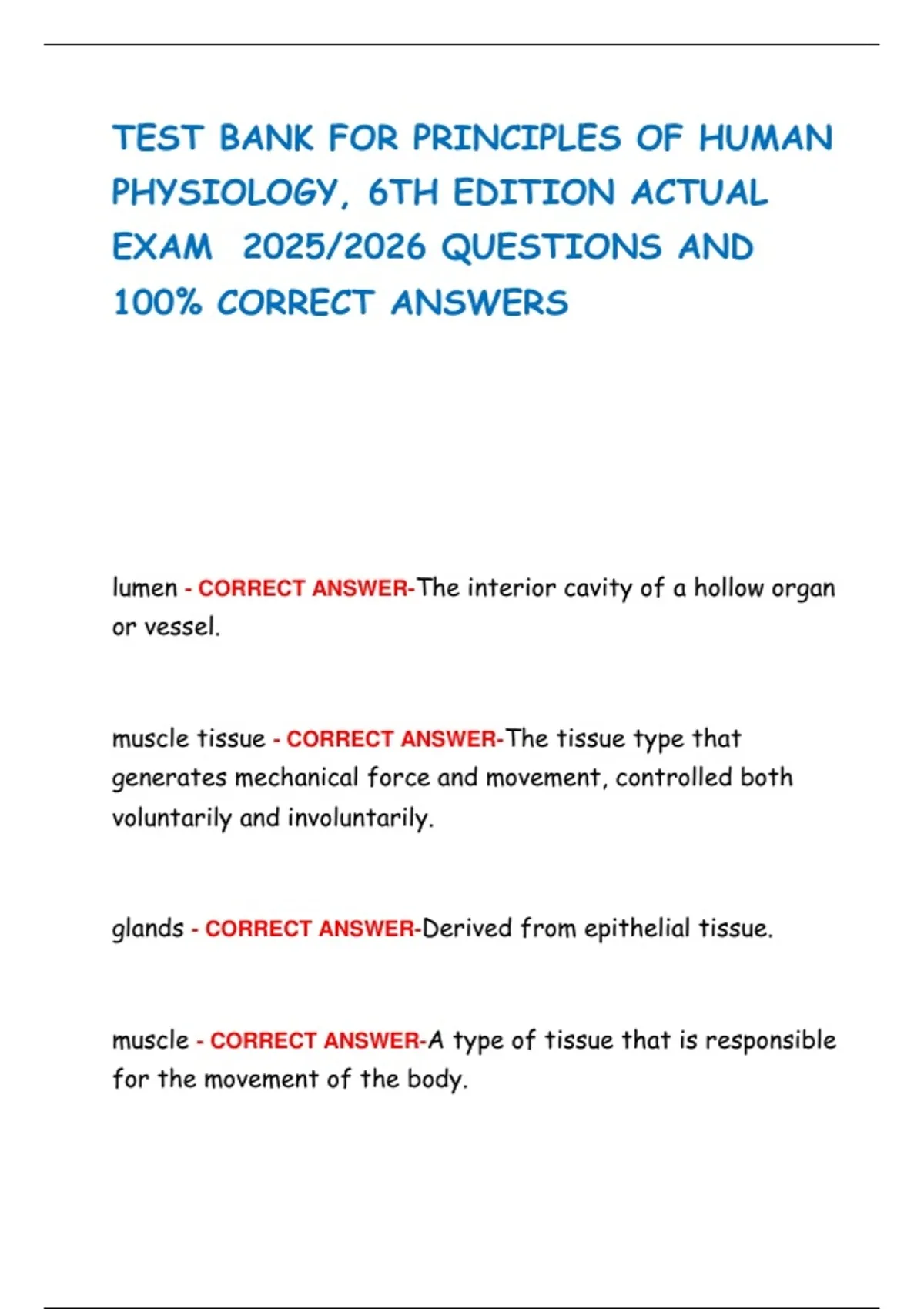 TEST BANK FOR PRINCIPLES OF HUMAN PHYSIOLOGY, 6TH EDITION ACTUAL EXAM 2025/2026 QUESTIONS AND 100% CORRECT ANSWERS