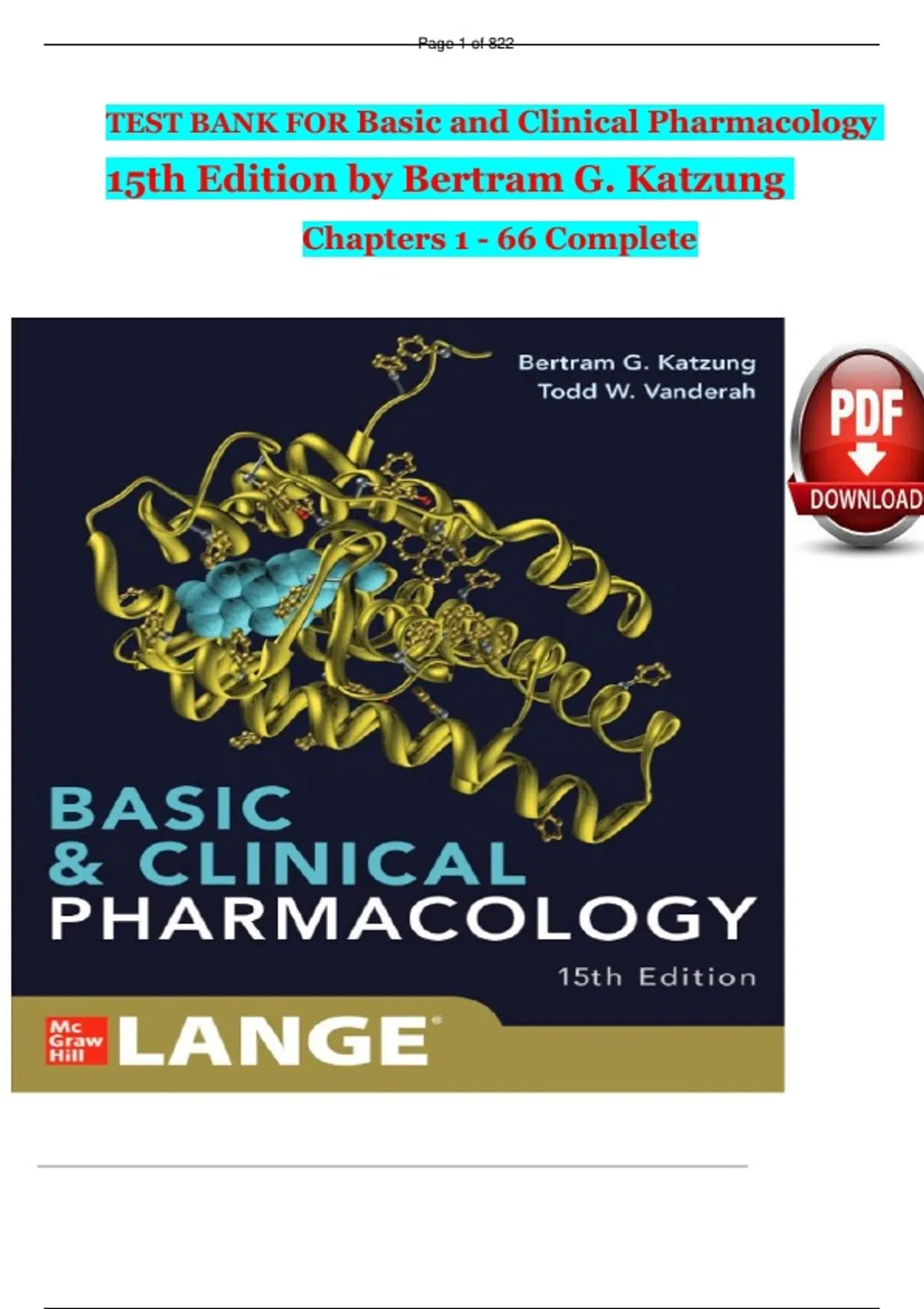 Ace your pharmacology exams with this complete Test Bank for Basic and Clinical Pharmacology, 15th Edition by Bertram G. Katzung and Anthony J. Trevor | ISBN-13: 978-1260452310. This verified and up-to-date test bank includes hundreds of real exam-style questions with correct answers and clear rationales, based directly on the latest 15th Edition textbook. It’s ideal for medical, nursing, dental, and pharmacy students preparing for exams, quizzes, and board reviews. Why students love it: 100% verified and accurate questions Fully aligned with the 15th Edition textbook content Covers pharmacodynamics, pharmacokinetics, mechanisms of action, therapeutic uses, and side effects Perfect for self-study, group revision, or instructor-led review Updated for the 2025/2026 academic year Study smarter and boost your pharmacology scores with this Katzung & Trevor Test Bank (ISBN-13: 978-1260452310) — your trusted resource for mastering drug mechanisms and clinical applications.